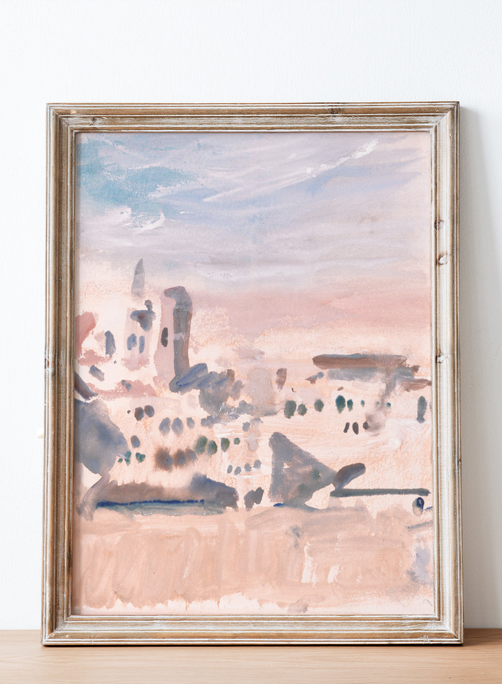 View of a Town by Hercules Brabazon Brabazon is a vintage watercolor cityscape featuring soft washes of pink, peach, and blue. This pastel hued poster adds a subtle architectural detail to your wall while bringing a dreamy, delicate palette to your space.