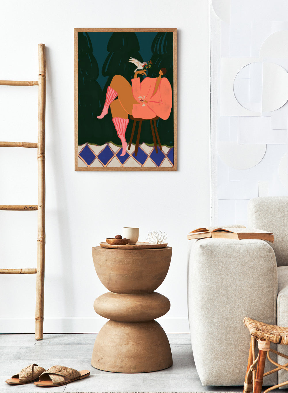 Illustration of a person in a pink dress sitting on a stool with a glass of wine, holding a dove with an olive branch. A Lil Birdy Told Me by Arty Guava is a modern woman art print with a bird, pink robe, and bold color. Officially licensed wall poster.