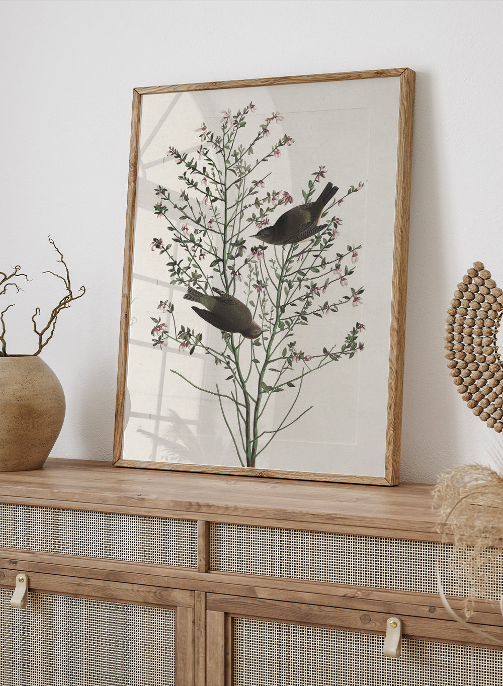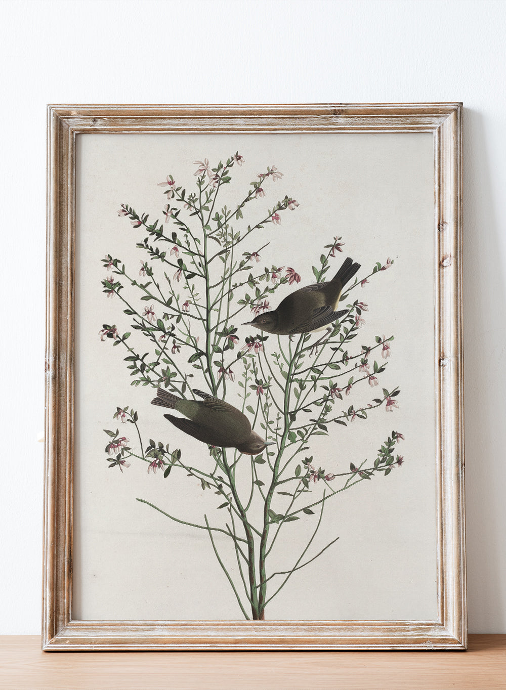 Robert Havell’s Orange-crowned Warbler showcases a delicate composition of birds nestled within slender flowering stems. With its soft palette and fine detail, this antique art print blends botanical illustration and ornithology into one elegant piece, ideal for floral gallery walls, vintage-inspired homes, or cozy cottagecore spaces.