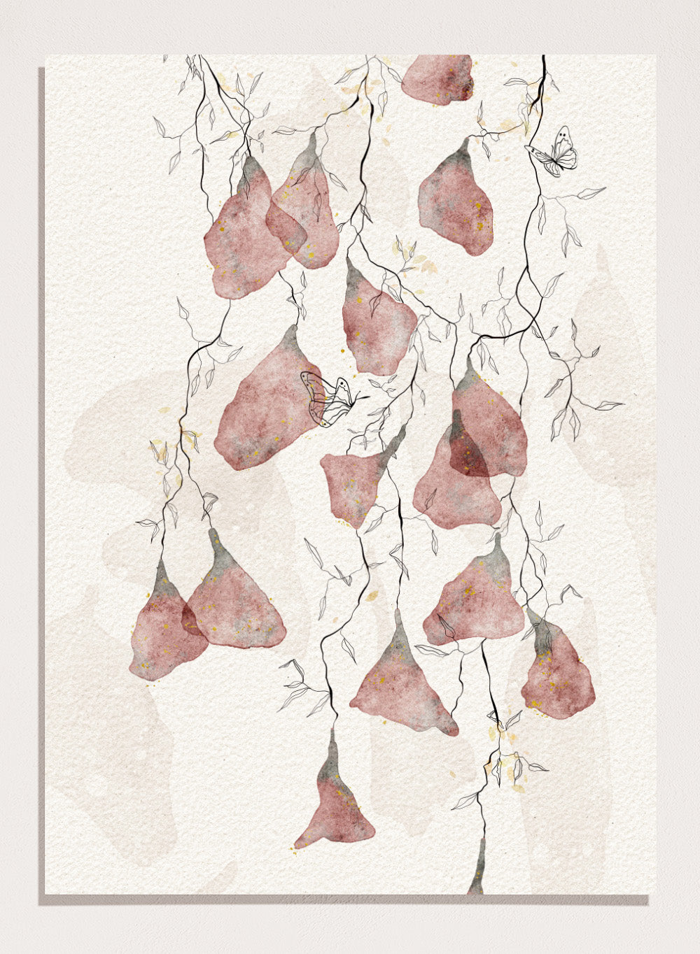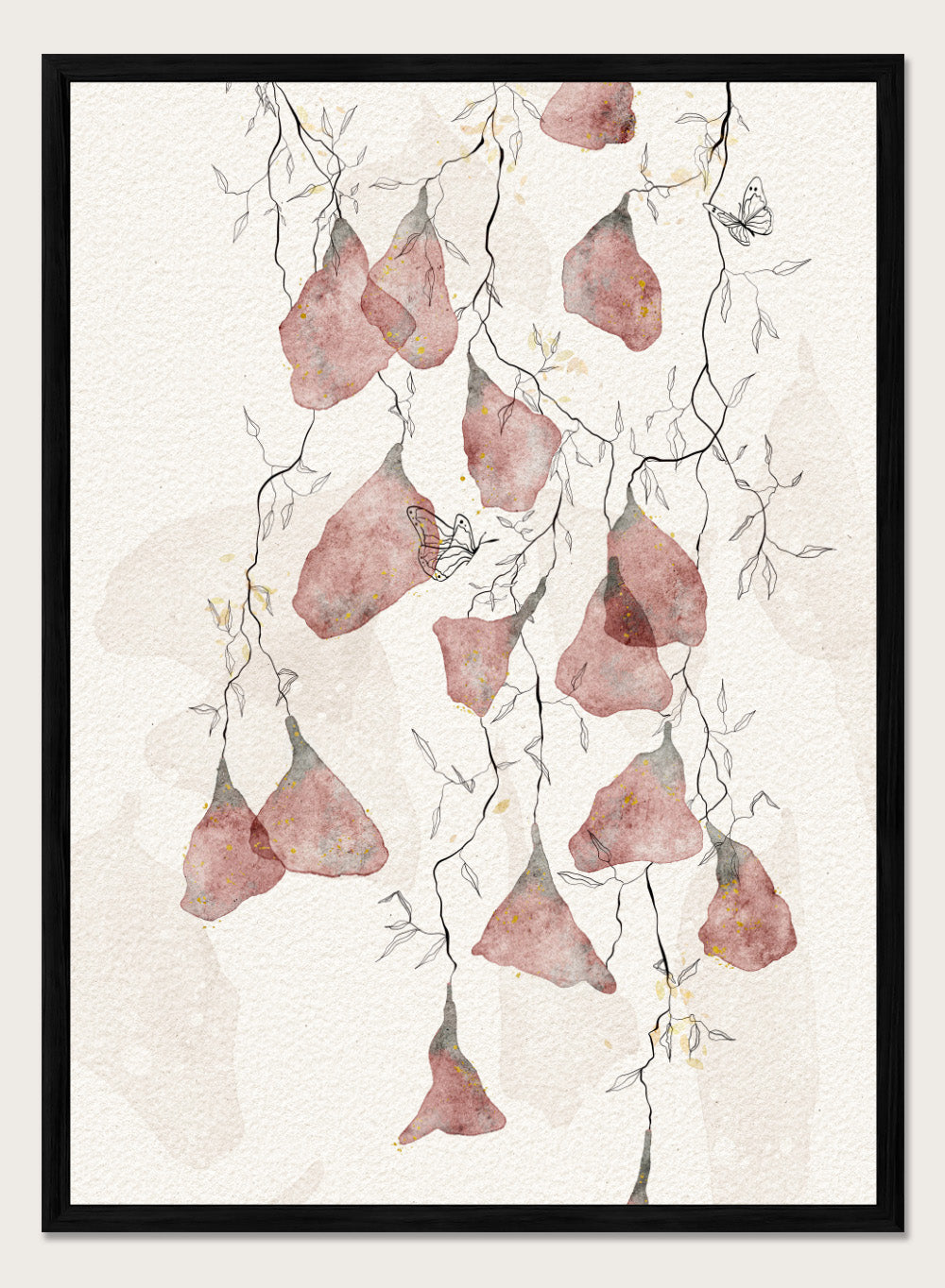 Artistic depiction of pink flowers and branches on a light background. Butterfly Kisses by Ankie Kooi features hanging watercolor flowers, delicate branches, and butterflies in soft neutral tones. Minimal botanical art print inspired by nature.
