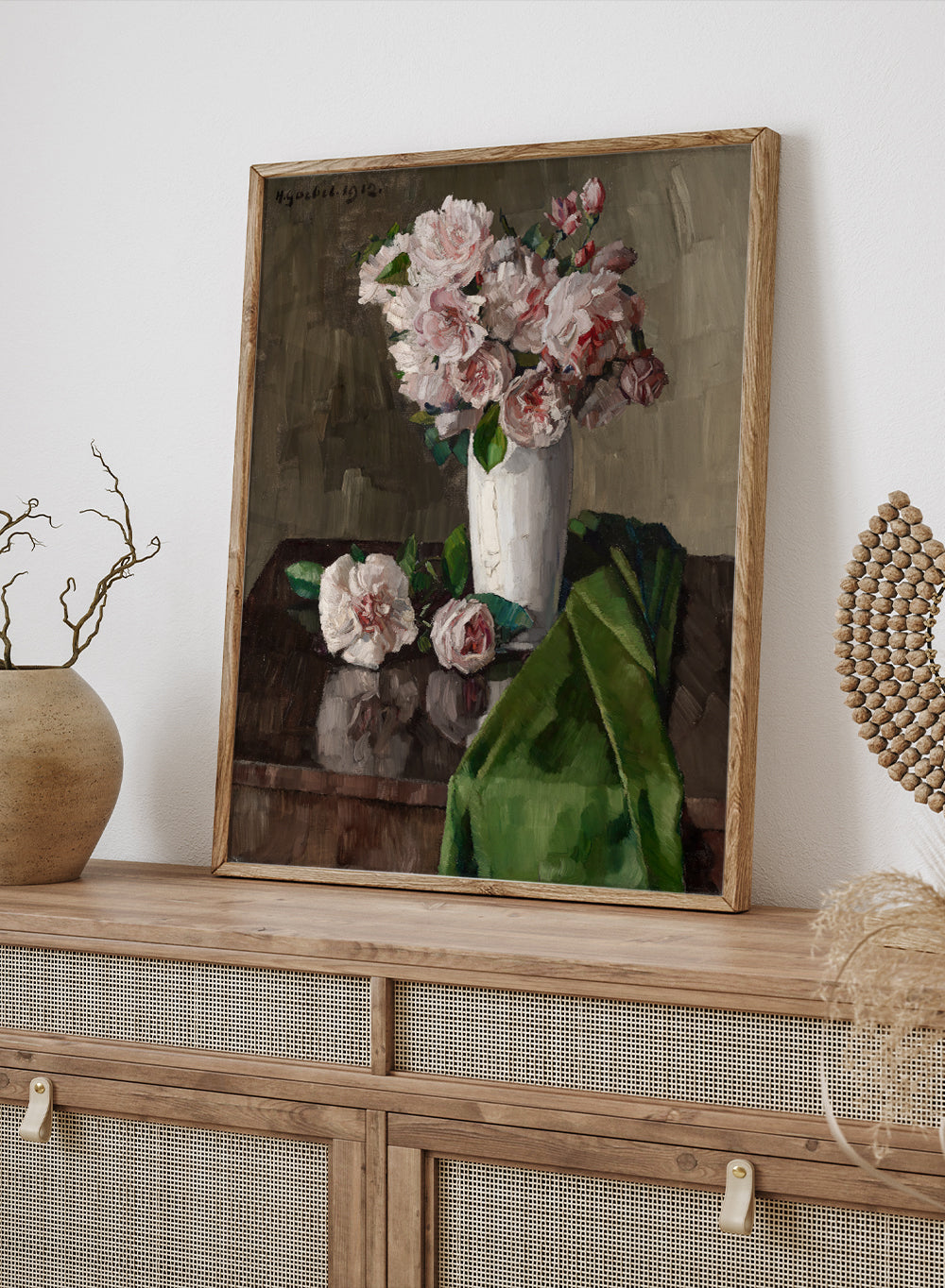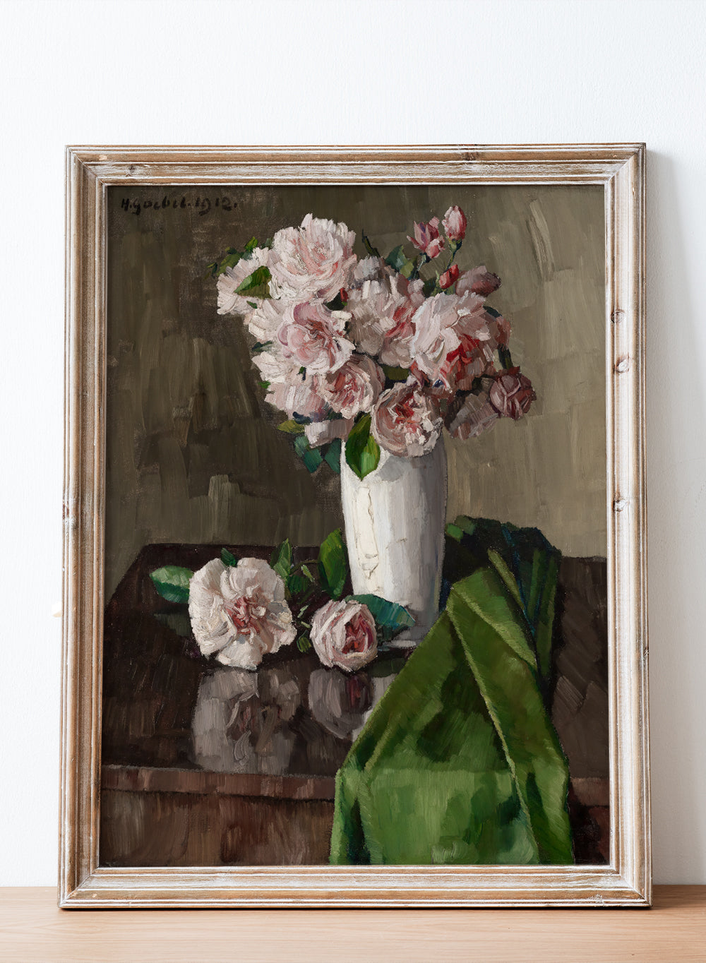 "Still Life with Pink Roses" vintage art print by Hermann Goebel captures a lush arrangement of blush-toned roses in a white vase, resting beside a folded green cloth in a moody setting. The contrast between the textured petals and dark dramatic lighting creates a compelling botanical scene.