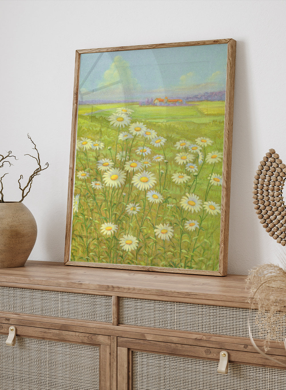 Wild Daisy by Lafayette F. Cargill is a cheerful countryside landscape bursting with tall daisies swaying in a sunlit wildflower summer field and a distant country village just visible on the horizon. This antique floral illustration brings warmth and light to cottagecore decor, rustic spaces, or vintage-inspired gallery walls.