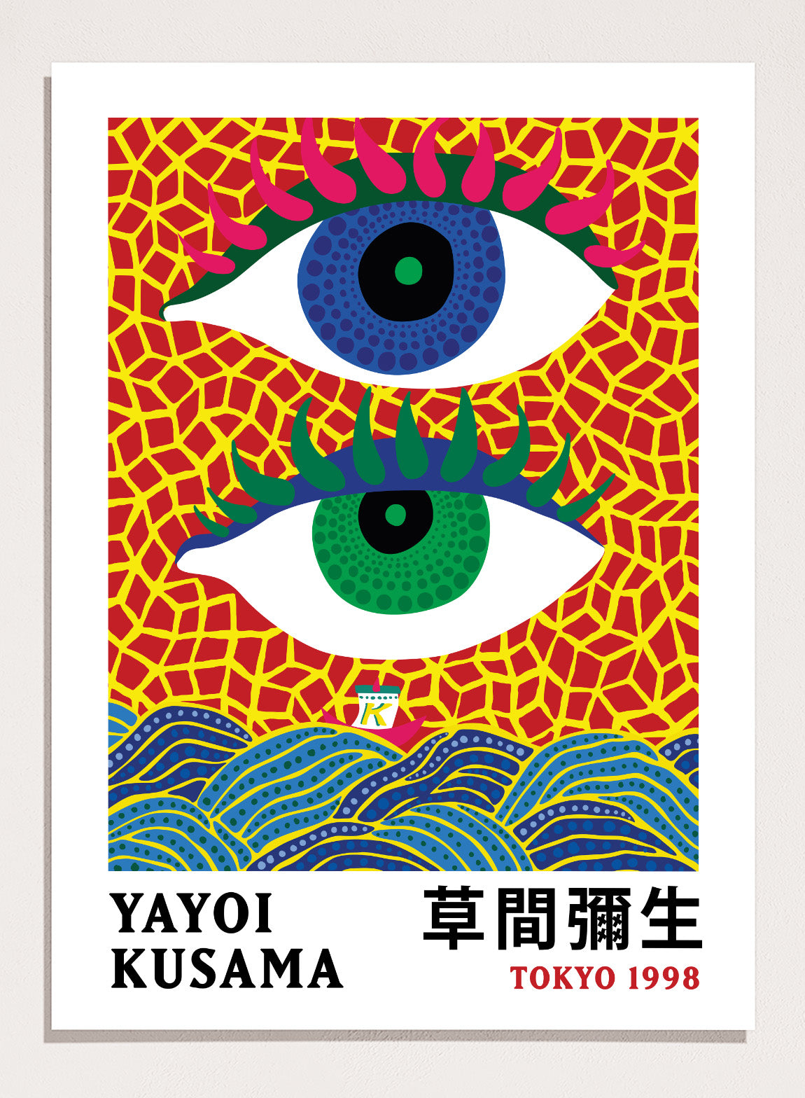 Inspired by Yayoi Kusama 草間彌生 On the Ocean Eyes Art, this exhibition Japanese poster art print showcases illustration of abstract eyes against ocean waves. Featuring vintage On the Ocean art, this Japani vintage exhibition poster by Yayoi Kusama is perfect for any boho, retro, minimalist, or abstract space.
