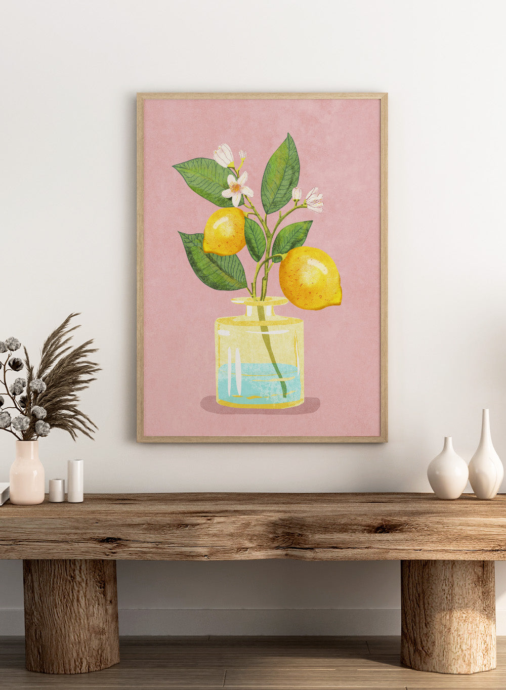 Illustration of lemons and a flower in a glass bottle on a pink background. Lemon Bunch In Vase by Raissa Oltmanns is a modern lemon still life art print featuring citrus fruit and floral kitchen wall poster design.