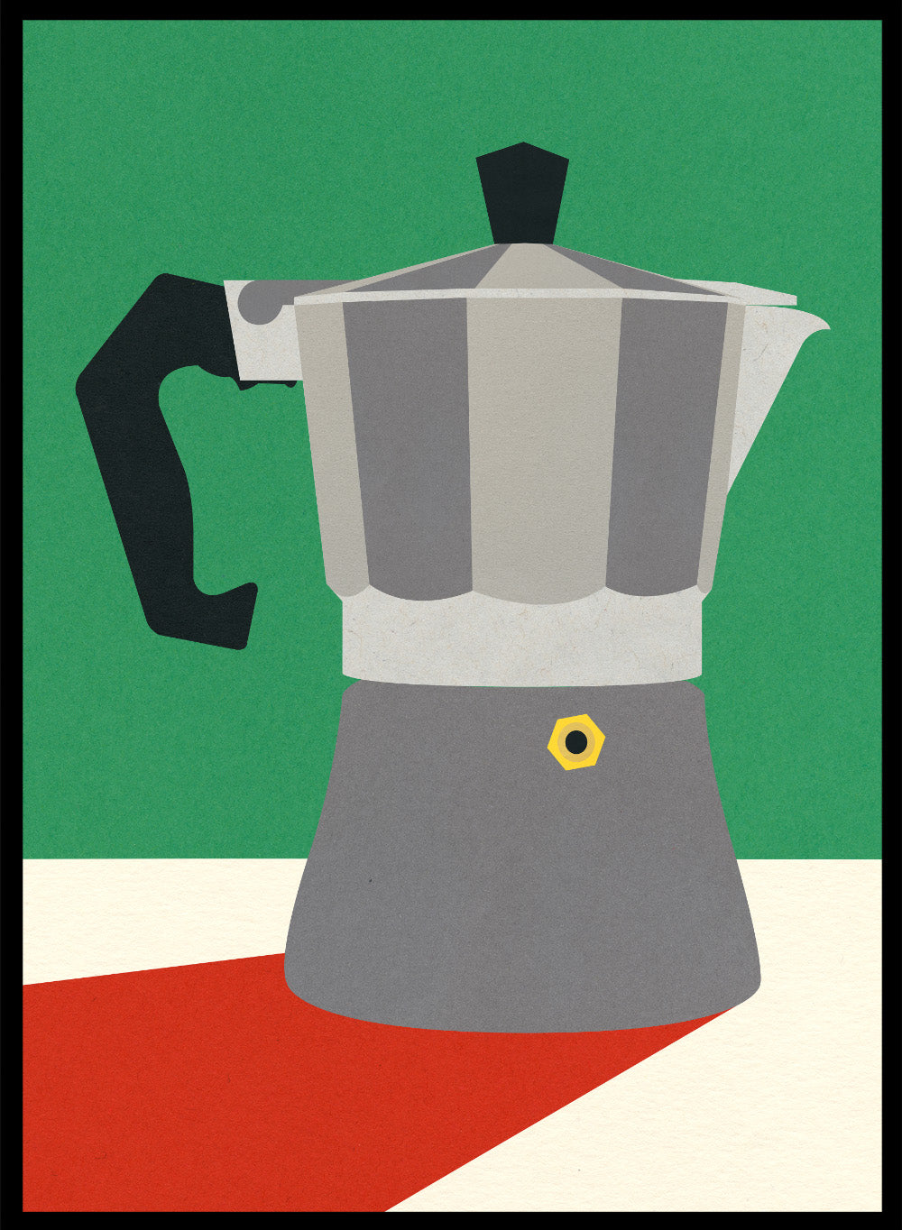 Stylized illustration of a Moka pot on a green, white, and red background. Stylized illustration of a Moka pot on a green, white, and red background. Espresso Italiano by Rosi Feist is a minimalist moka pot kitchen art print with Bauhaus-inspired color. Officially licensed modern poster with framing.