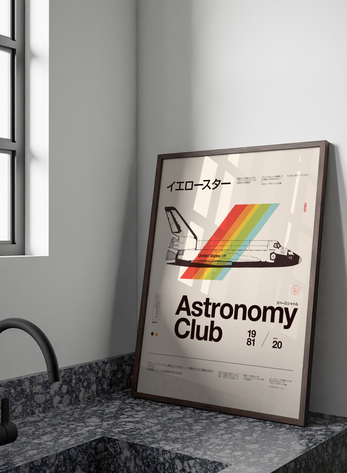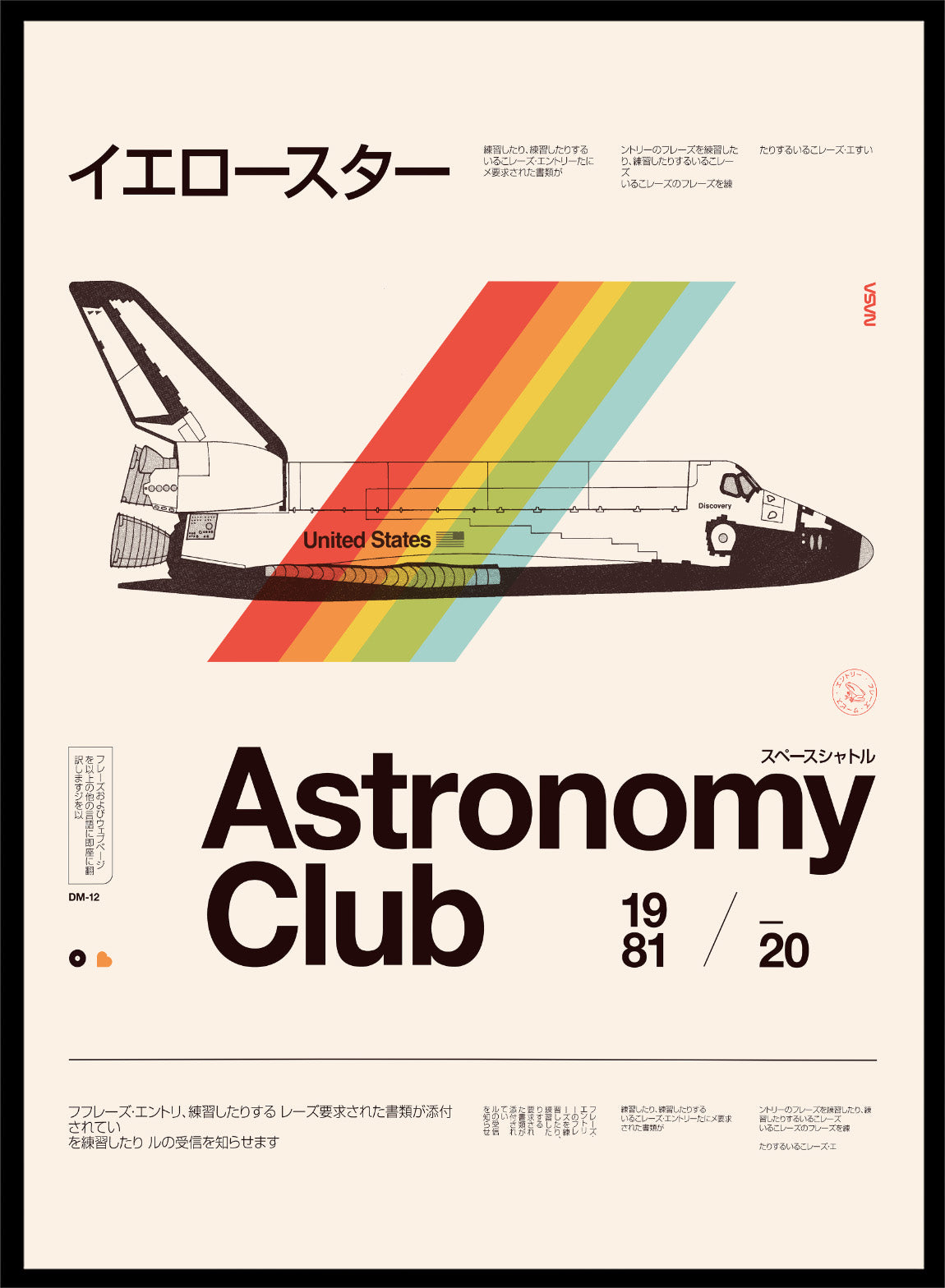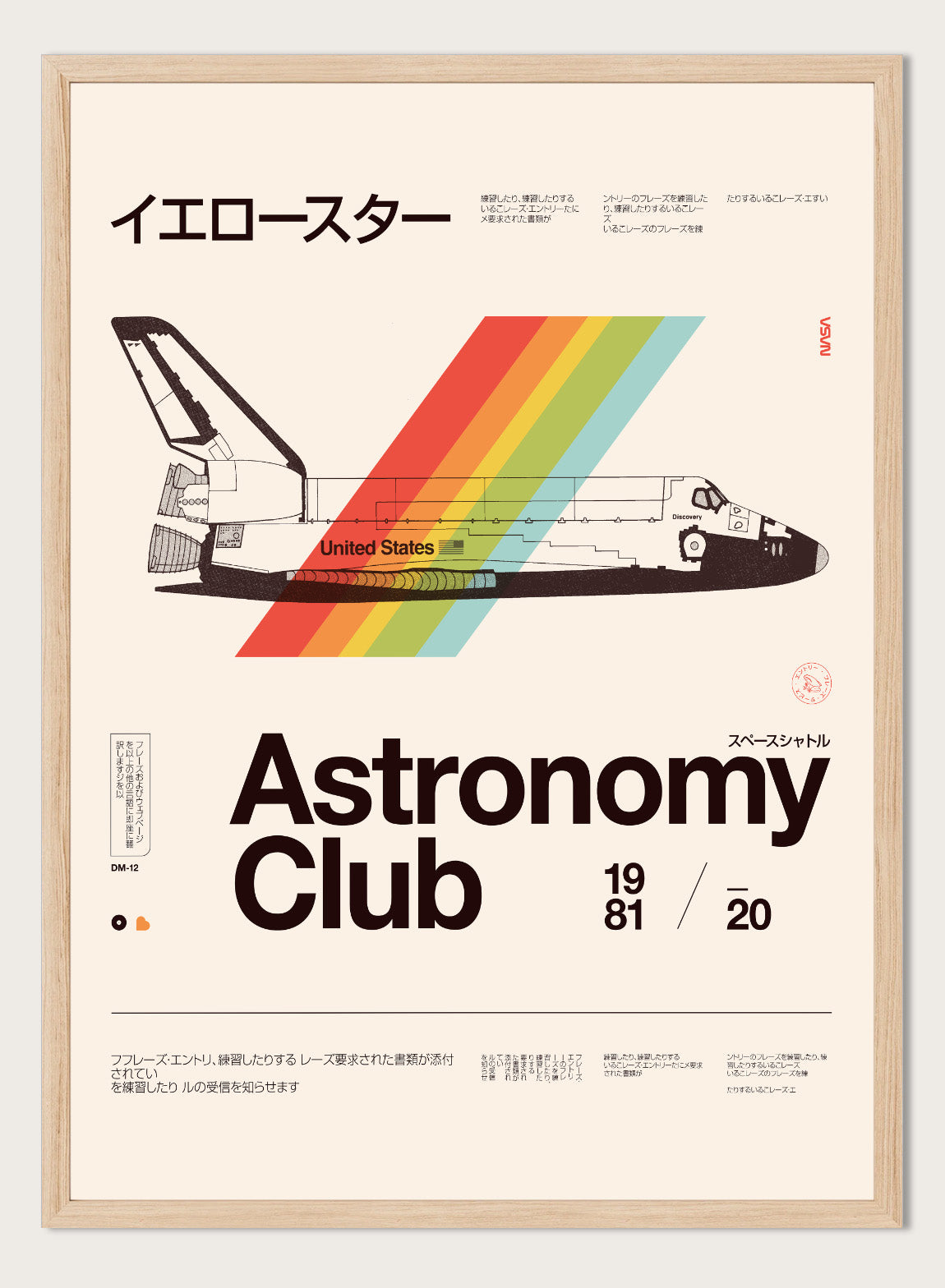 Retro Space Shuttle Rainbow by Florent Bodart brings a classic piece of space history into a bold, graphic format. The shuttle is rendered with clean, technical detail, while a diagonal band of rainbow color cuts through the composition, adding movement and energy. The structured layout, typography, and muted background keep it grounded in retro poster design, while the color brings a modern edge. It feels precise, graphic, and visually striking without losing its sense of play.