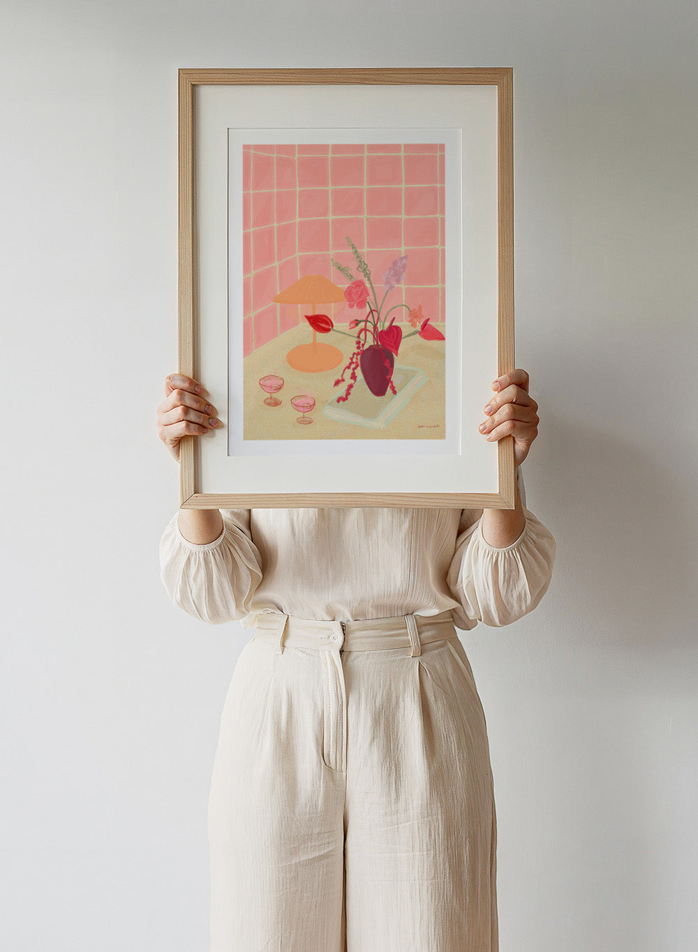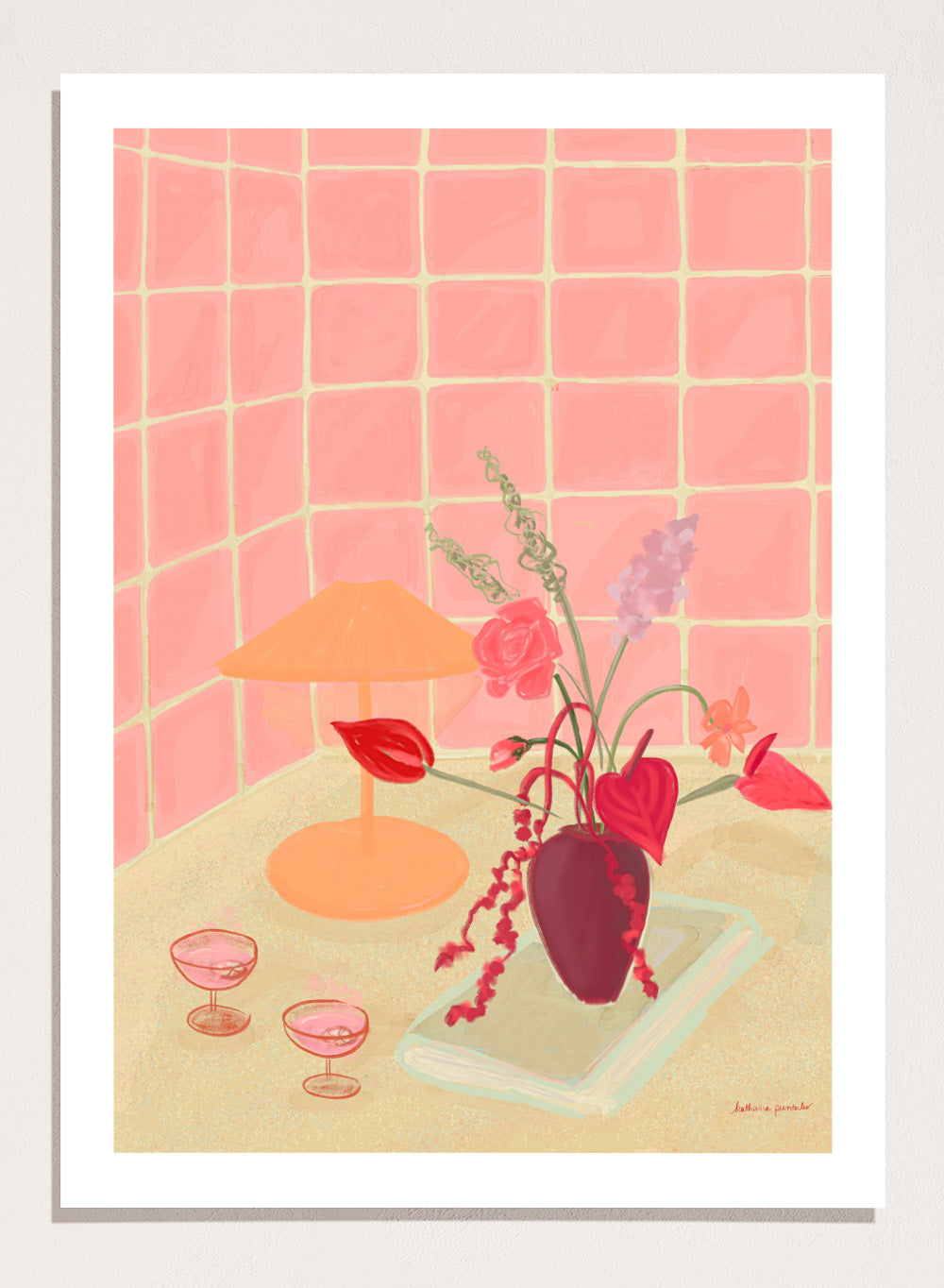 Bubbly by Katharina Puritscher is an illustration built around color, mood, and small everyday pleasures. A pink tiled wall sets the backdrop for an intimate tabletop moment. A sculptural red vase holds loose florals with heart-shaped petals, soft greens, and pops of lavender, arranged casually rather than perfectly. Two coupe glasses sit nearby, half-filled, as if someone just stepped away.