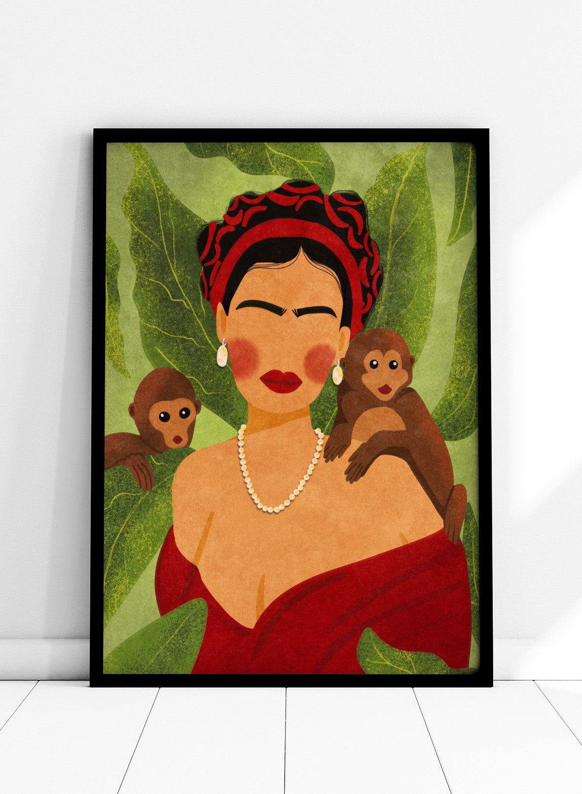 Frida and Monkeys by Raissa Oltmanns brings Frida Kahlo into Raissa’s bold, modern style. Frida stands centered, wrapped in red with her signature brow and strong expression, while two small monkeys rest on her shoulders. The green leaves in the background frame her without distracting from her presence.