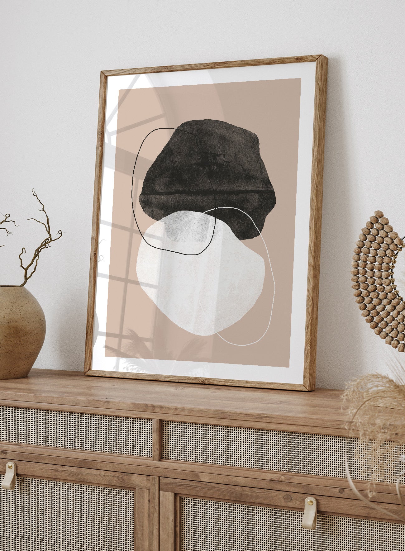 Earthy Abstractions by The MIUUS Studio layers organic shapes in a way that feels loose but controlled. A dense black form sits over a soft off-white shape, both slightly textured, with thin lines drifting across and tying everything together. Nothing is perfectly aligned, which gives it that natural, grounded feel.