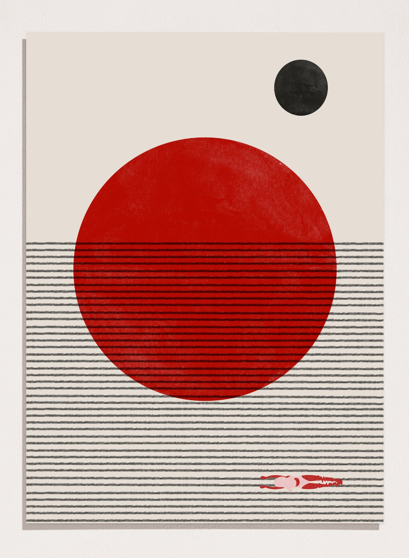 Floating Horizons by The MIUUS Studio places a large red circle low across a field of horizontal lines, with a smaller dark circle above it. In the lower right, a tiny swimmer moves through the lines, which shifts the whole piece into something more spatial. What starts as a flat composition begins to read as distance, scale, and depth, with the swimmer grounding everything and giving the forms context.