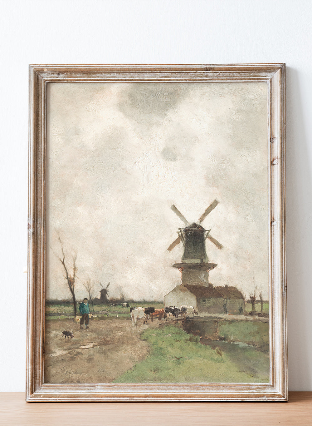 The Mill by Jan Hendrik Weissenbruch is a serene 19th-century Dutch landscape that captures a windmill standing tall under a soft, overcast sky. With cows grazing nearby and a solitary figure walking the path, the painting captures the beauty of the ordinary. This vintage European art print is perfect for adding moody texture and antique character to farmhouse, cottagecore or neutral-toned decor.