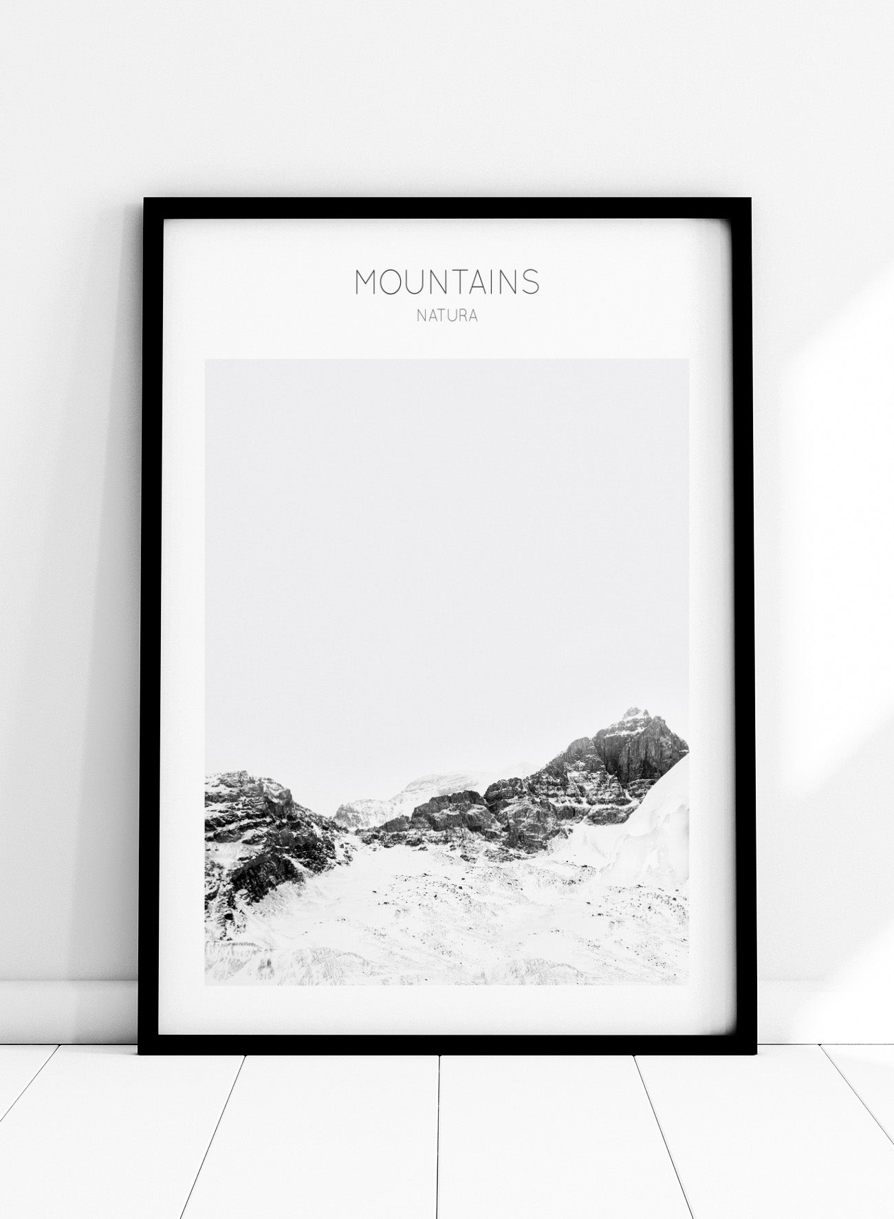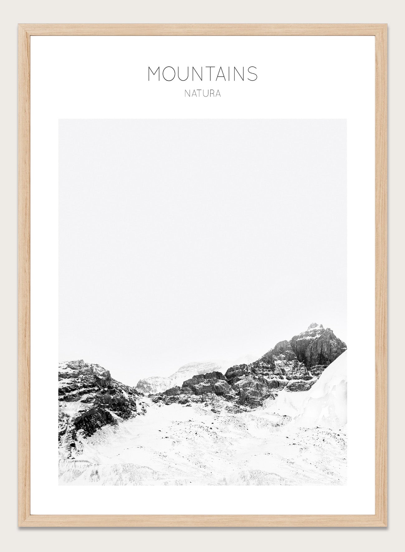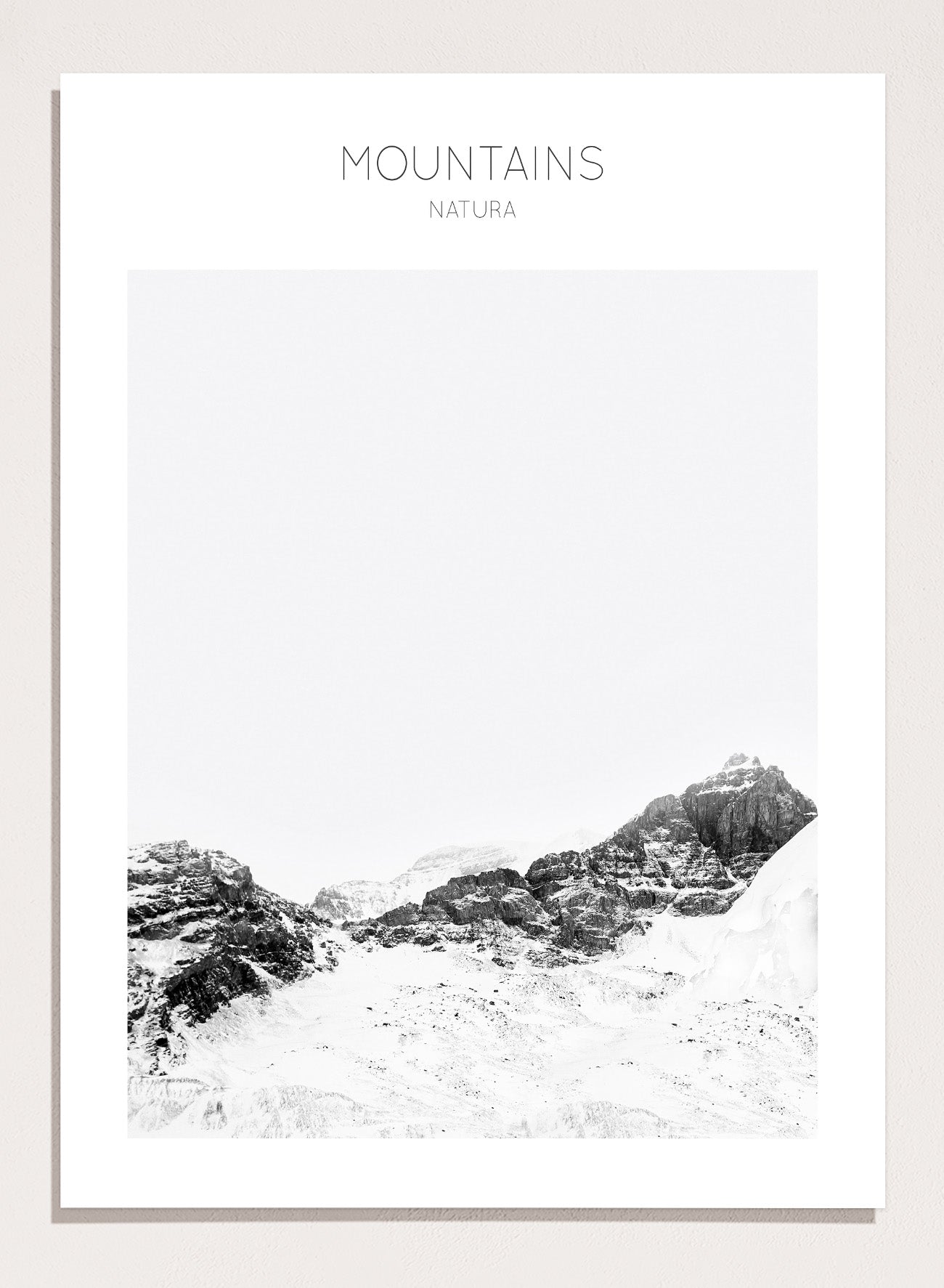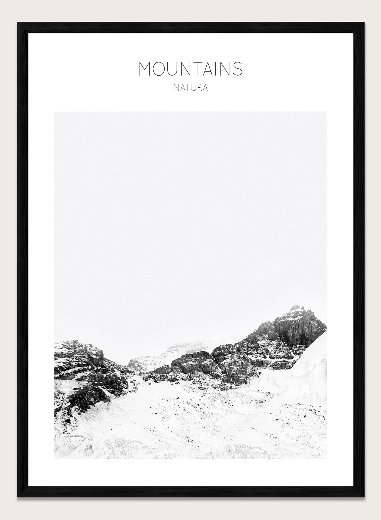Black and white mountain landscape with 'Mountains Natura' text. Serene Peaks by The MIUUS Studio is a black and white mountain photography art print and wall poster featuring snowy peaks, minimalist composition, and modern neutral design.