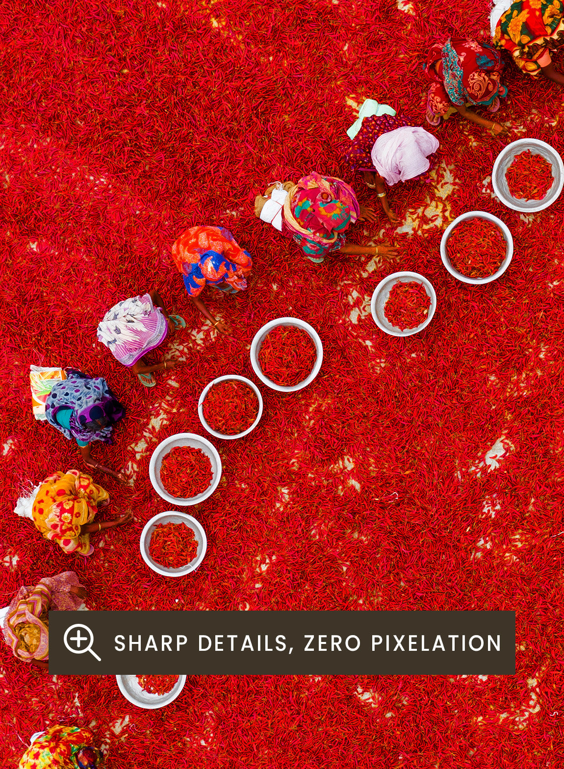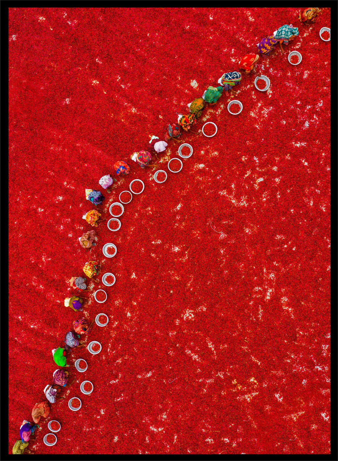 Picking Red Chilies by Azim Khan Ronnie shows workers harvesting and gathering bright red chilli peppers across an expansive field in Bogura, Bangladesh. Captured through aerial photography, the entire frame becomes a dense surface of red, broken only by a curved line of workers moving through the field. Their placement creates a strong visual flow across the image, while the scale of the harvest highlights the intensity of the work. This process supports local spice production, where chillies play a central role in Bengali cuisine and are used daily across a wide range of dishes.