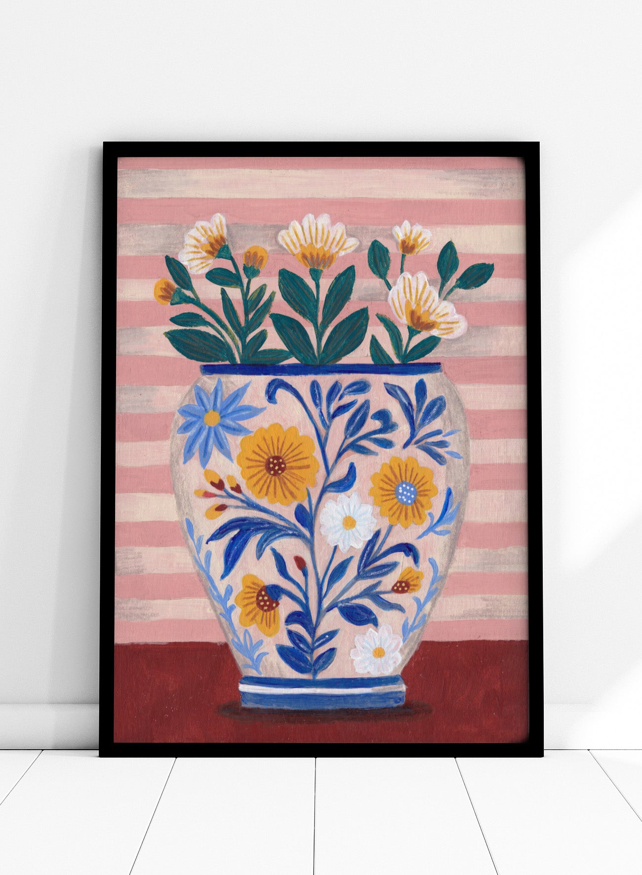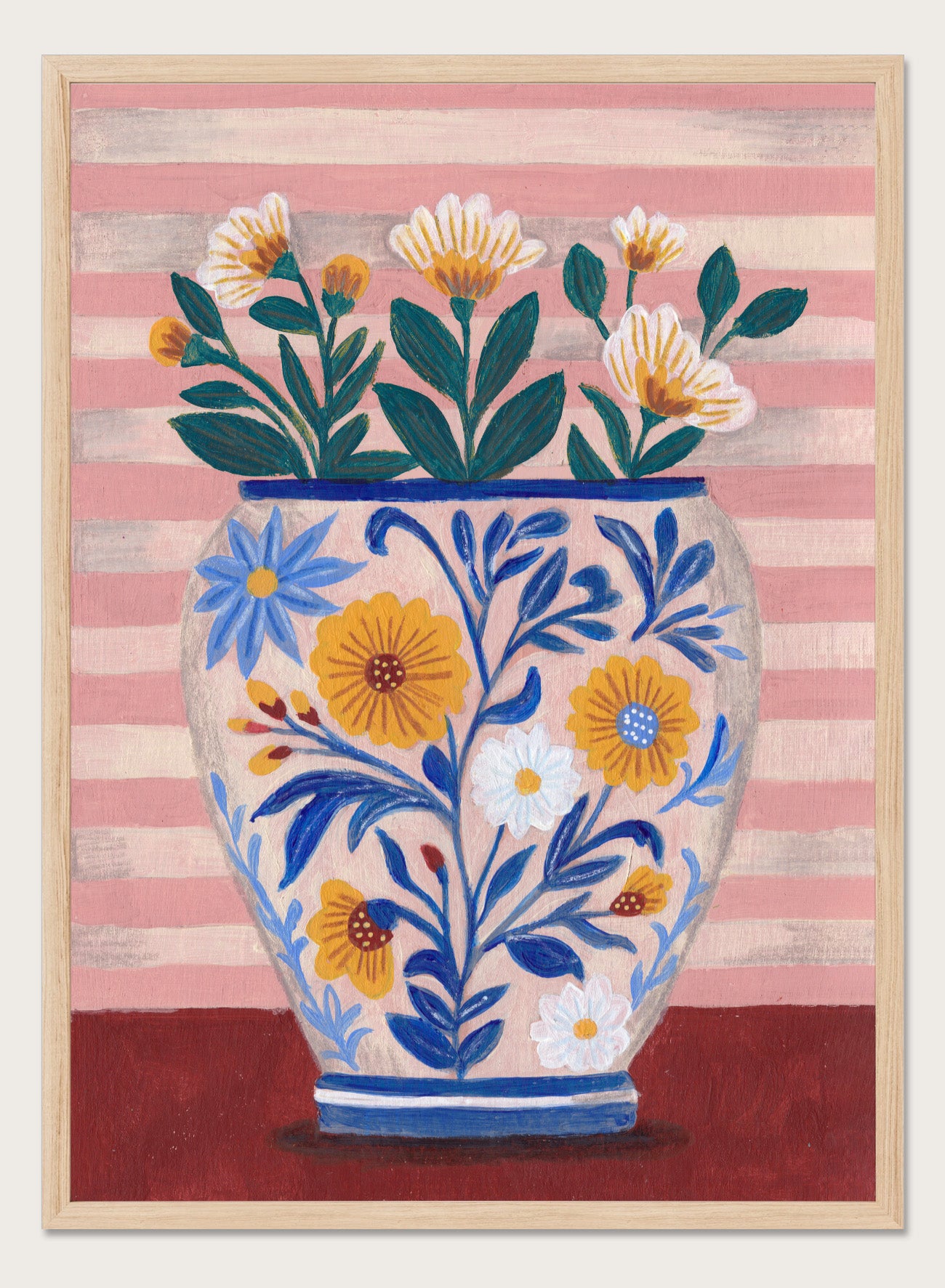 Potted Florals Pastels & Stripes by Caroline Bonne Müller places a blue floral vase at the center with a few stems spaced apart, white and yellow blooms sitting at different heights. The pink striped background runs vertically behind it, while the solid red surface underneath keeps the base steady. The patterned vase and striped backdrop sit right against each other, which is what gives the piece its structure.