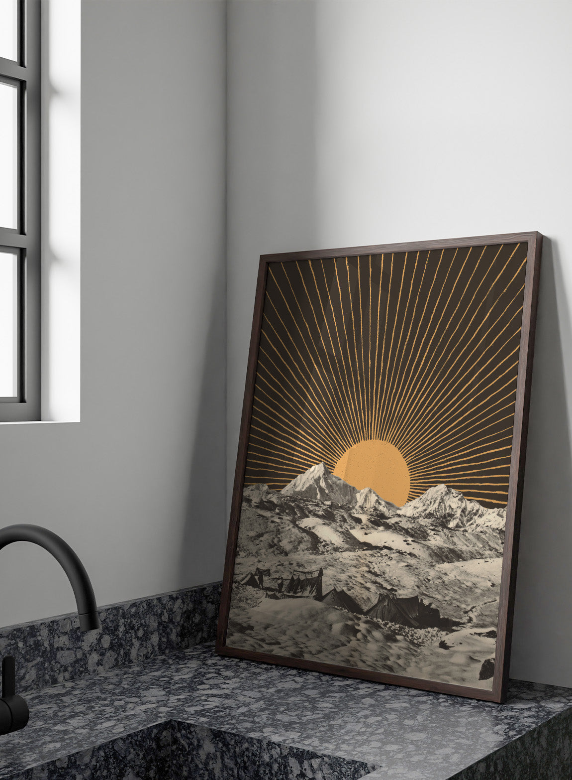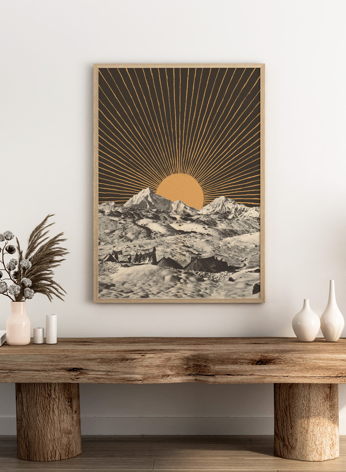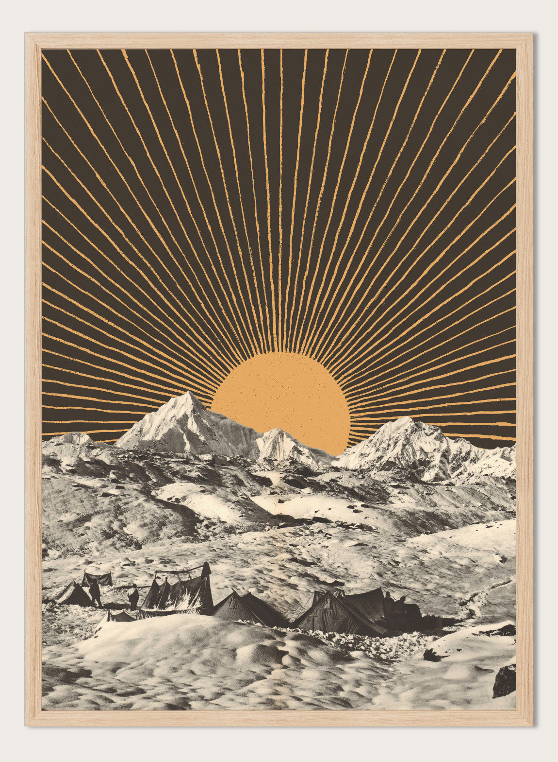 Mountain Base Camp Sunrise by Florent Bodart combines vintage landscape photography with bold graphic elements. A detailed mountain range stretches across the composition, grounded by a row of tents in the foreground, while a large sun rises behind the peaks. Radiating lines extend outward, adding energy and contrast against the dark sky. The mix of realistic texture and graphic design creates a strong visual balance, making the scene feel both grounded and stylized.