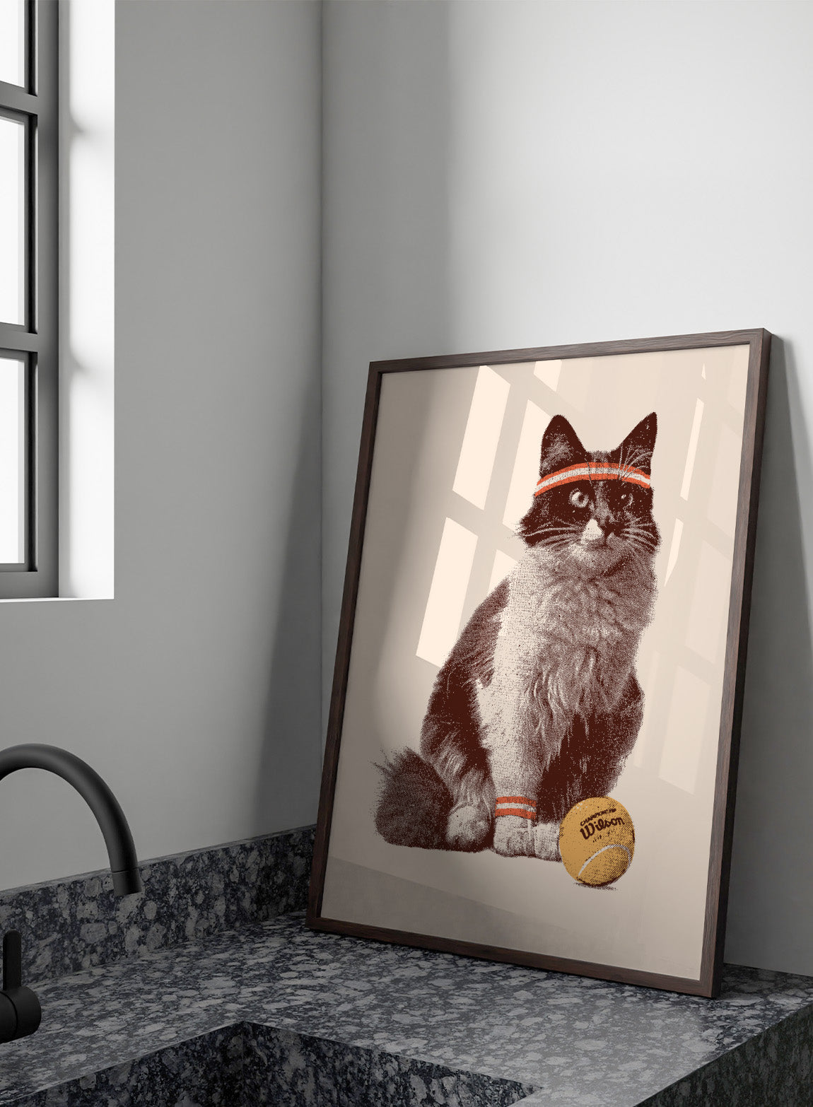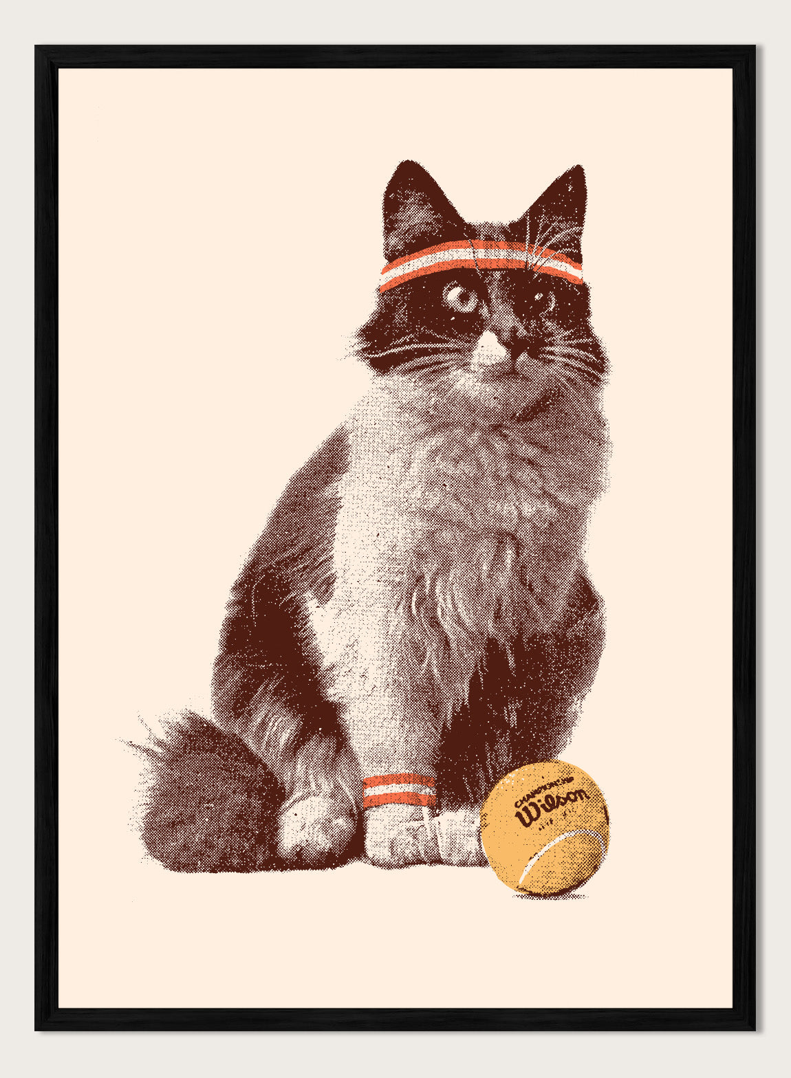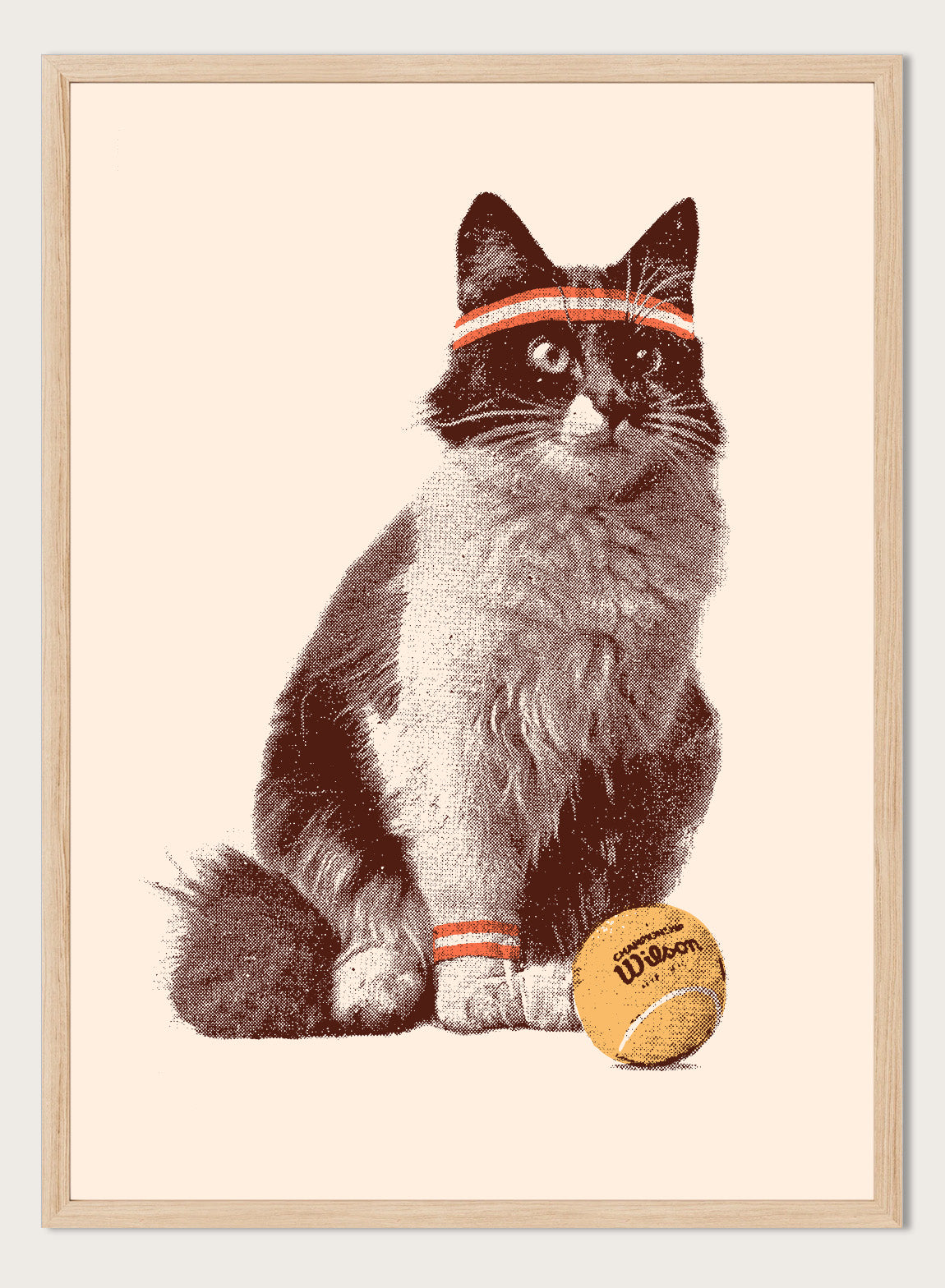 Retro Tennis Cat by Florent Bodart turns a fluffy cat portrait into something playful and unexpectedly sporty. Styled with a retro headband, matching wristbands, and a tennis ball at its side, the piece mixes realistic animal detail with vintage athletic cues in a way that feels funny and visually sharp. The halftone texture gives it an old-school printed look, while the warm, limited palette keeps the whole composition clean and cohesive. It’s charming, graphic, and full of personality.
