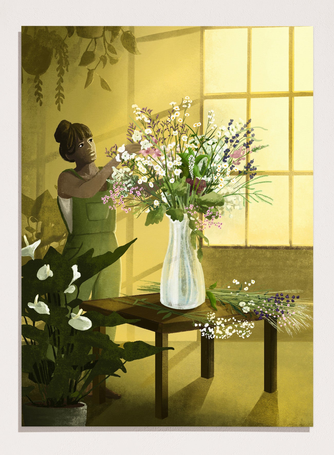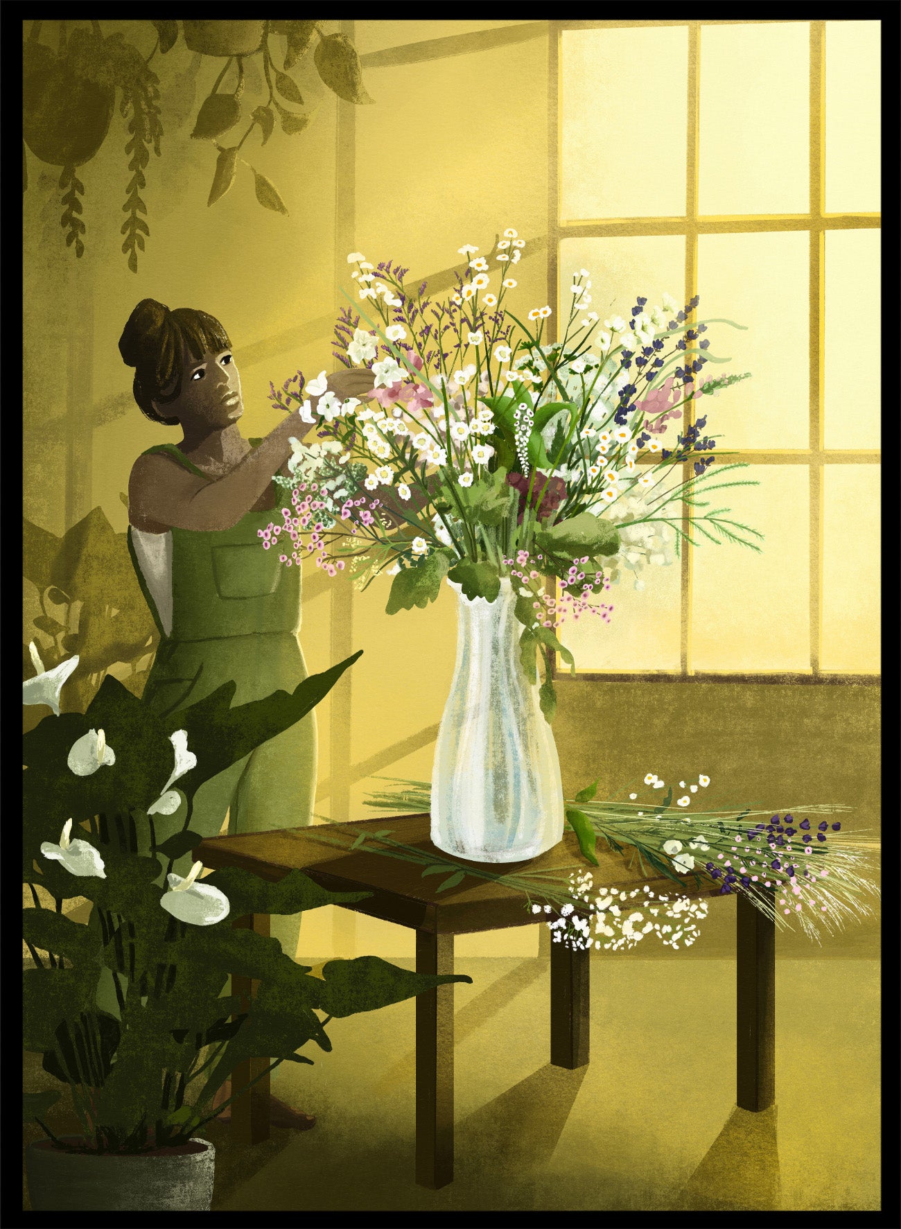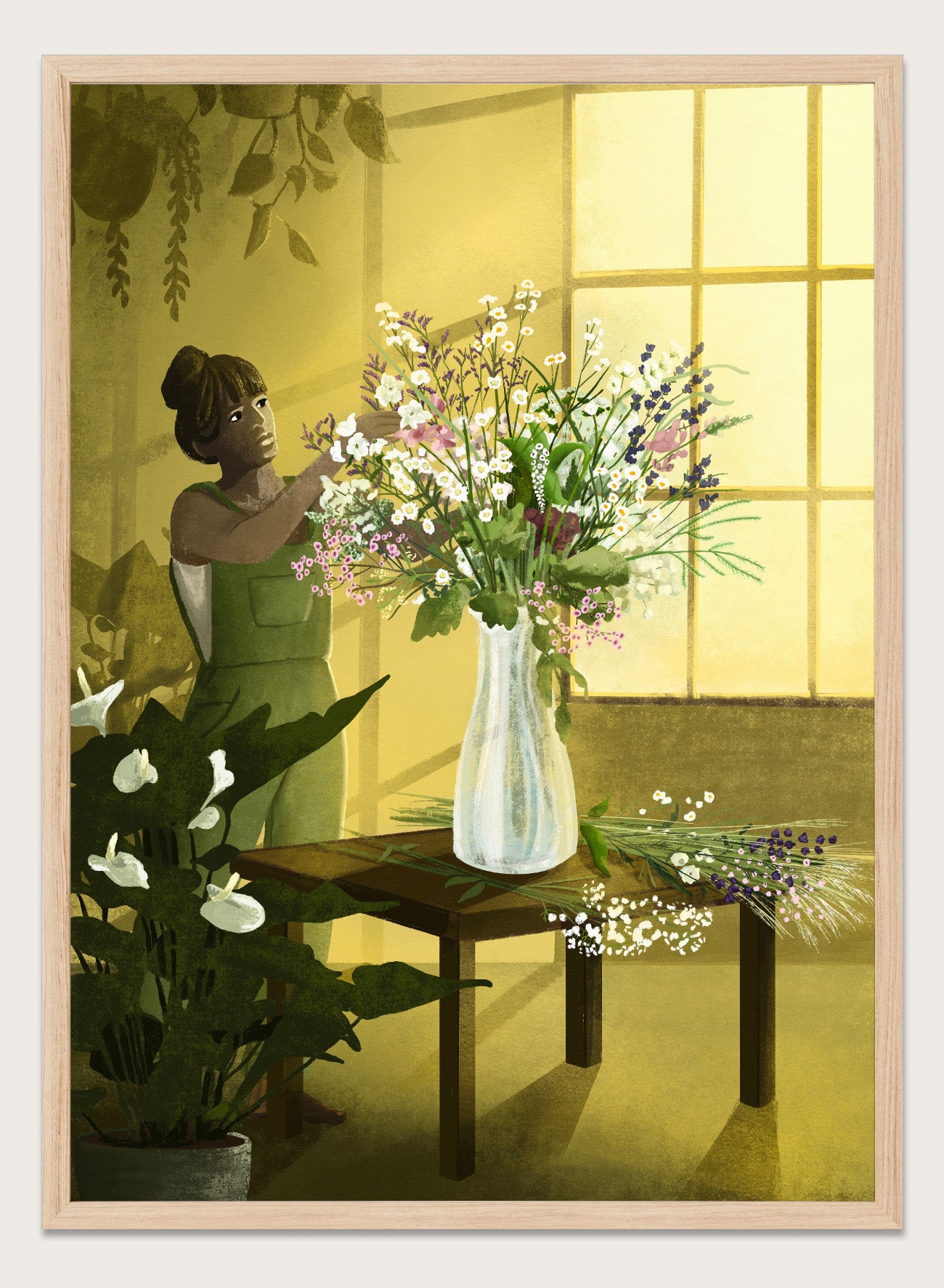 In the Cracks of Light I Dream by Goed Blauw shows a woman arranging a large, loose bouquet in a tall vase by the window. The light comes in strong and warm, casting long shadows across the table and floor. The flowers feel full and slightly wild, with stems and small cuttings scattered around. Everything is built around that intimate moment of focus, where the light, the movement of her hands, and the softness of the flowers all come together.