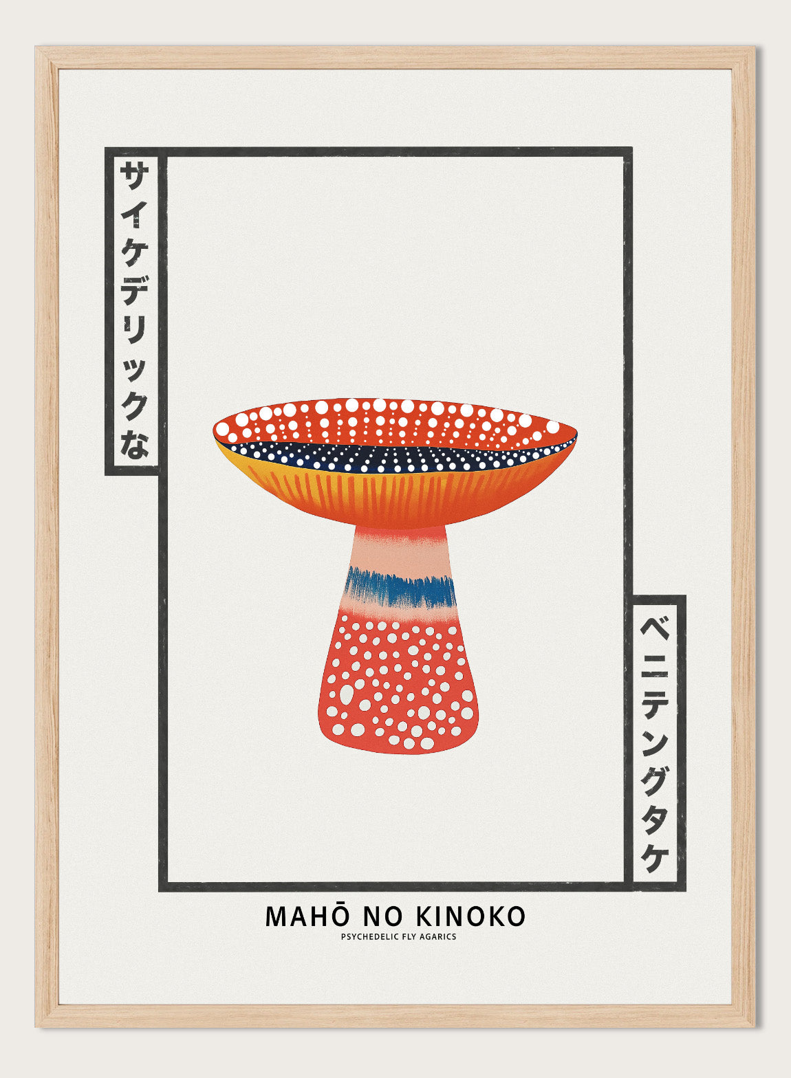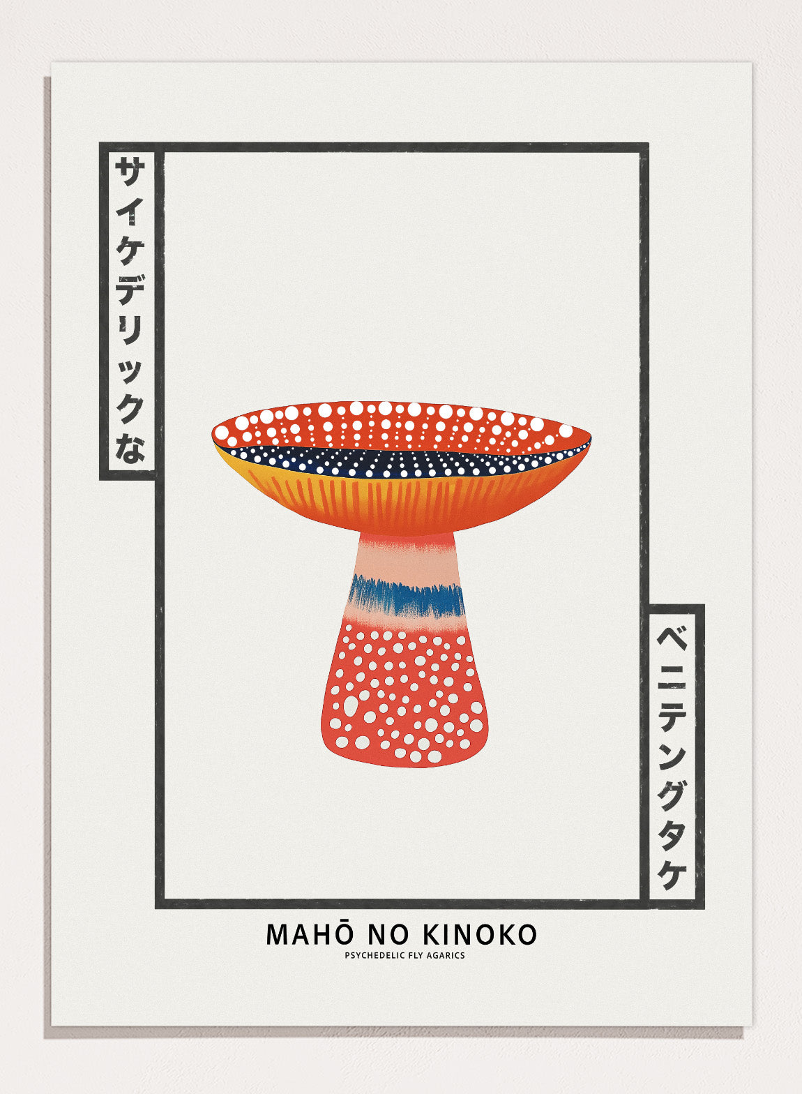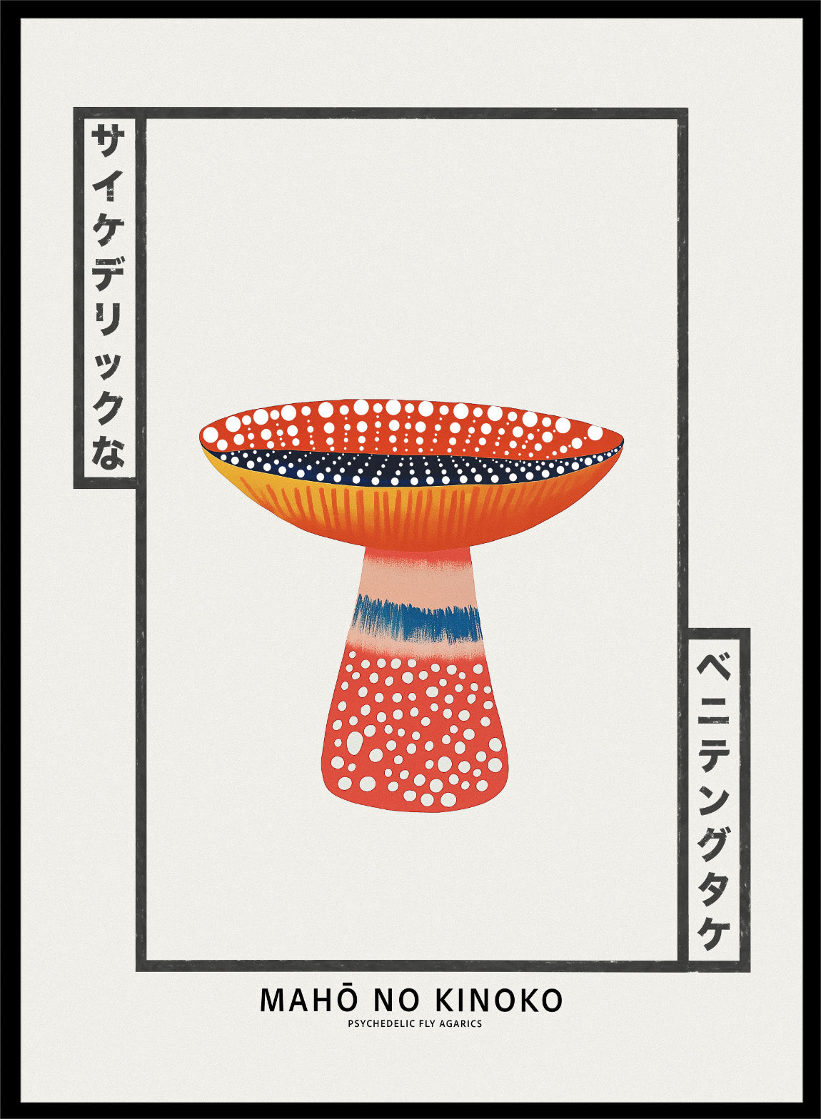Mahō no Kinoko – Psychedelic Fly Agaric shows a stylized mushroom illustrated with bold color and simple shapes. The wide orange cap is dotted with small white spots, while a darker patterned band underneath adds contrast before the thick stem drops down in warm coral tones. The mushroom feels less like a scientific drawing and more like a graphic symbol with a slightly surreal character. Centered inside a simple black frame with vertical Japanese lettering, the composition has the feeling of a modern poster that blends nature with graphic design.