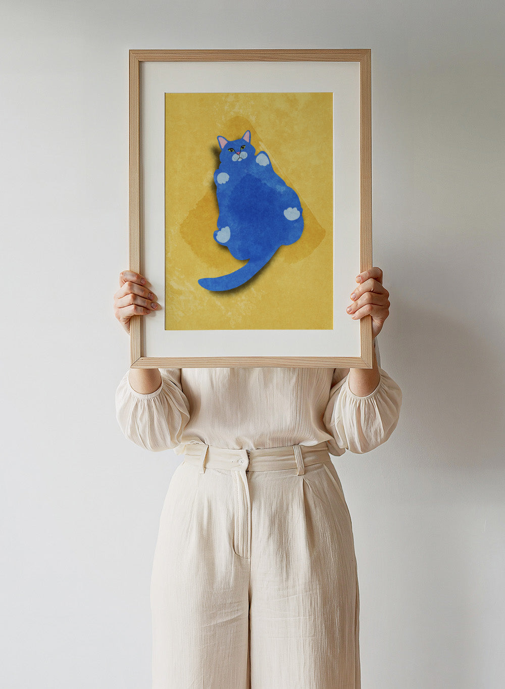 Blue cat illustration on a yellow textured background. Fat Cat by Raissa Oltmanns is a modern cat art print featuring a bold blue feline on yellow background in contemporary wall poster style.
