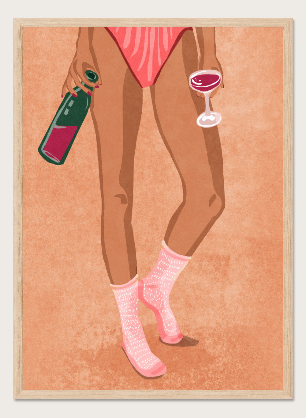 Illustration of a person's legs wearing pink socks with text, holding a bottle and a glass on a peach background. Wine and Socks by Raissa Oltmanns is a modern woman art print featuring wine bottle and glass in bold contemporary wall poster style.