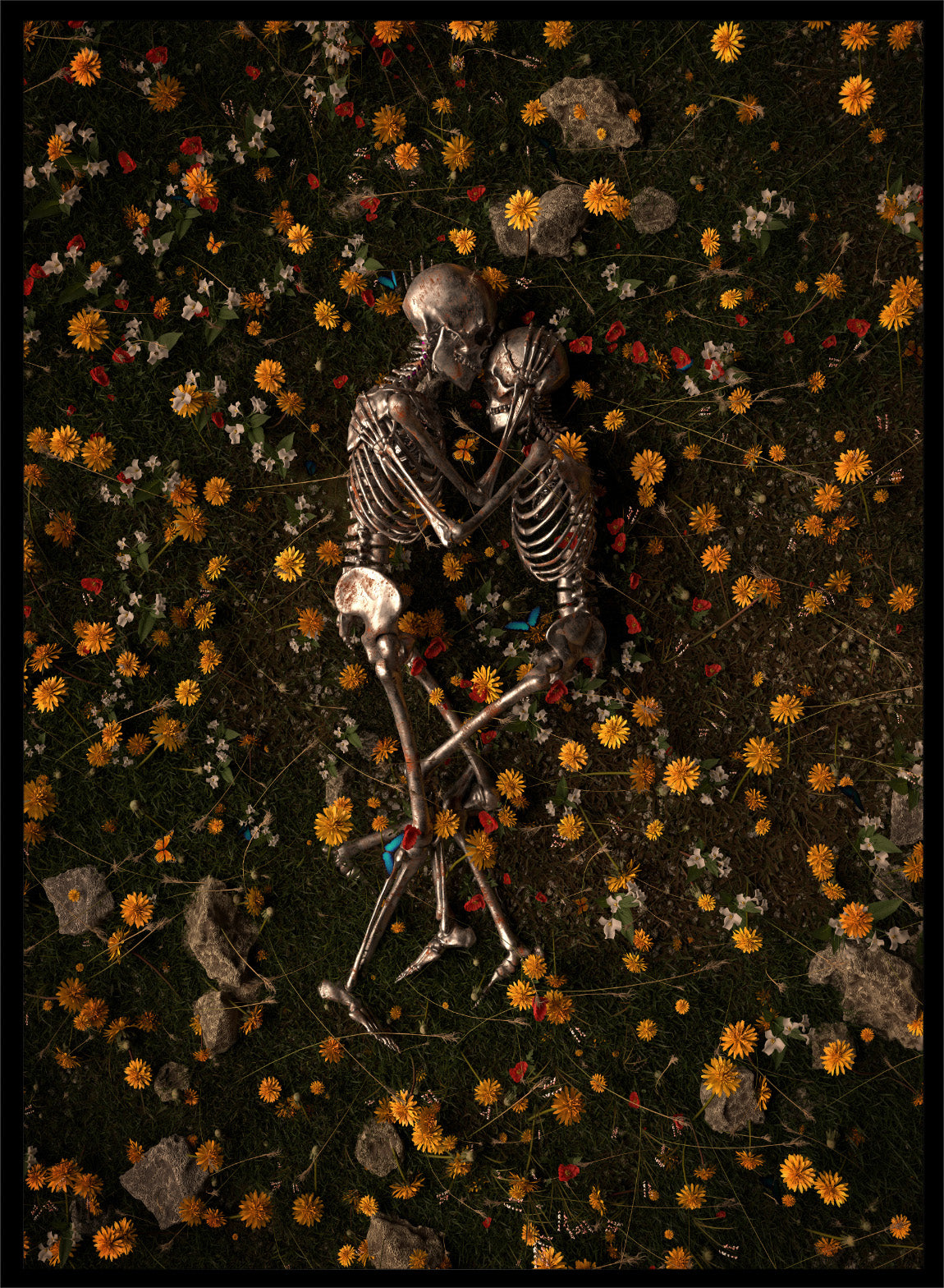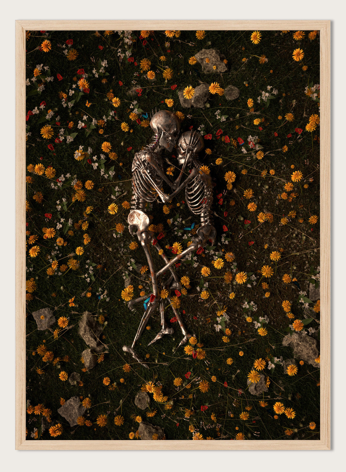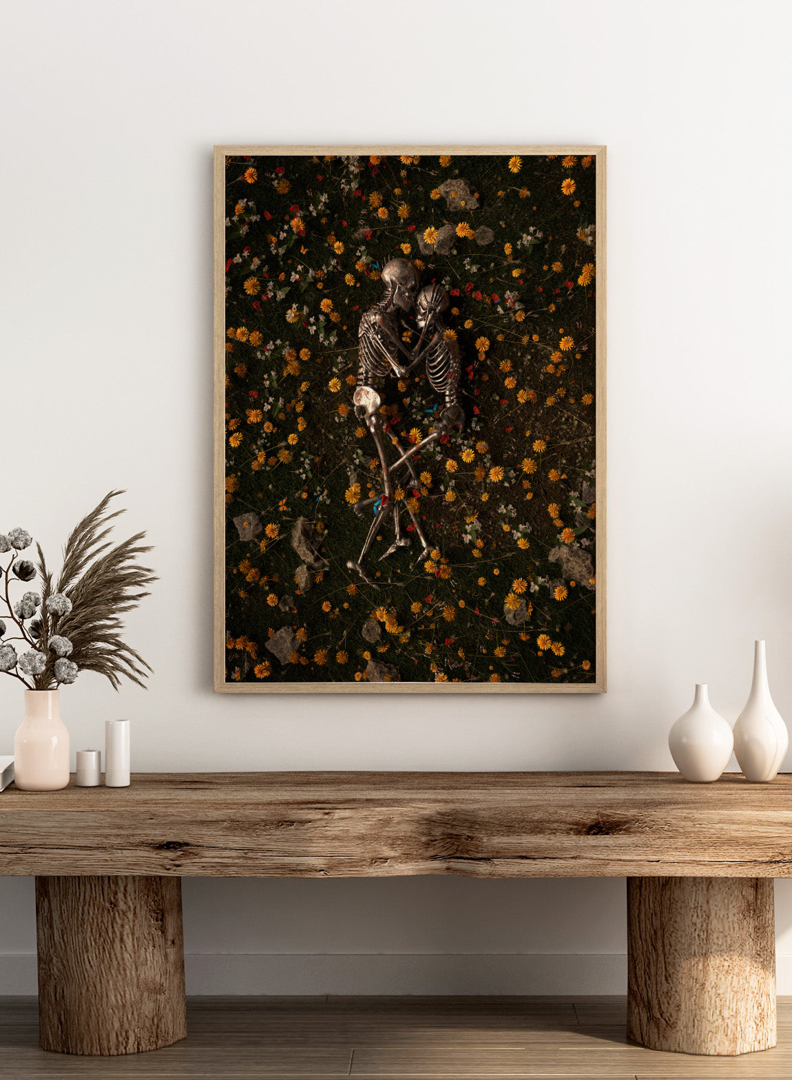 Skeletons In Love by Nicebleed shows two skeletons wrapped around each other, lying in a field of scattered wildflowers. Their bodies are intertwined, faces close, hands held in a way that feels quiet but intentional. Around them, the ground is full of small yellow and red blooms, bits of greenery, and texture that fills the entire frame. It’s detailed, a little unexpected, and instantly catches your attention.