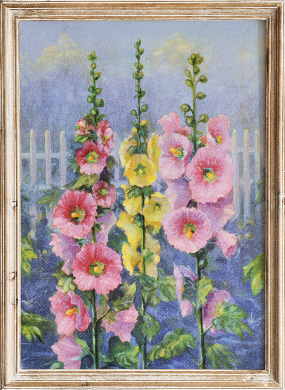 Hollyhock by Lafayette F. Cargill (1937) bursts with pink and yellow florals climbing along a soft garden fence. The composition blends soft background tones with striking floral color, creating a vintage botanical print full of life, light, and movement.