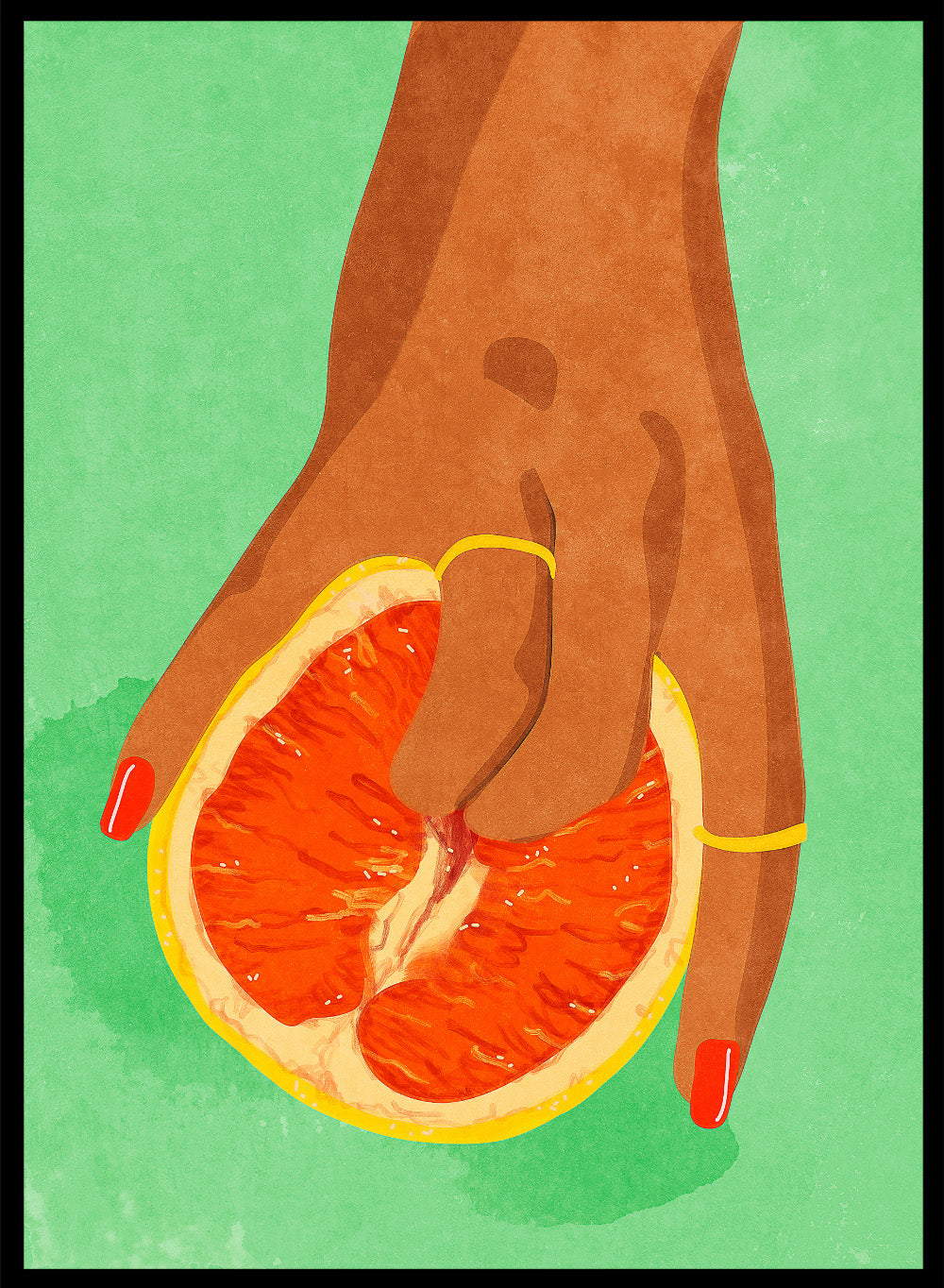 Fruit Lover by Raissa Oltmanns is bold, playful, and intimate. A hand with bright red nails holds a sliced citrus fruit against a fresh green backdrop, turning a simple image into something sensual and expressive.
