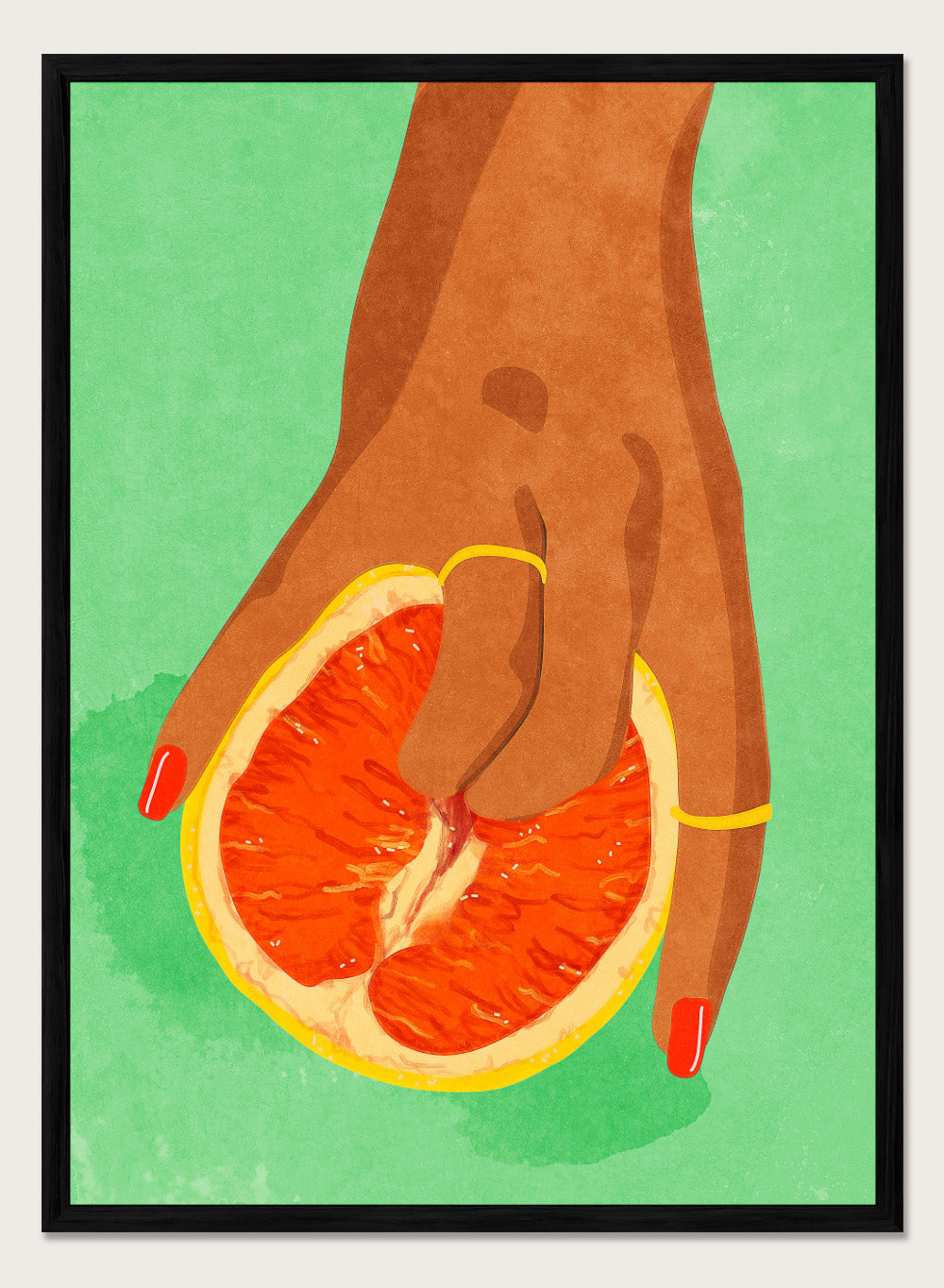 Illustration of a hand holding a sliced orange against a green background. Fruit Lover wall art print by Raissa Oltmanns blends playful citrus and intimate symbolism in a contemporary modern aesthetic poster.
