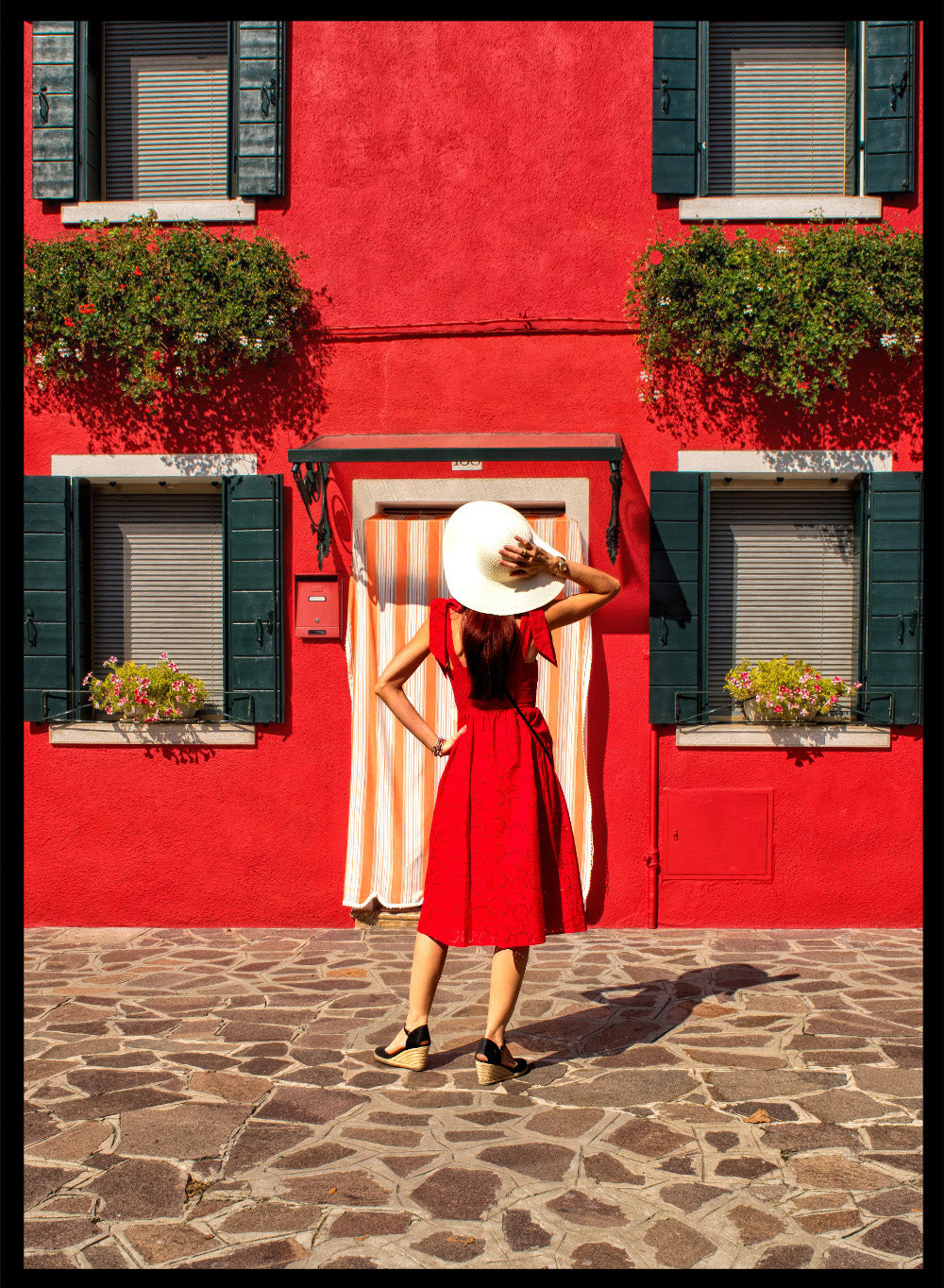 Woman in a red dress and white hat standing in front of a red wall with green shutters. Red Art Print by Anette Ohlendorf featuring a woman in a red dress standing against a red building. Officially licensed travel photography with strong color and symmetry.
