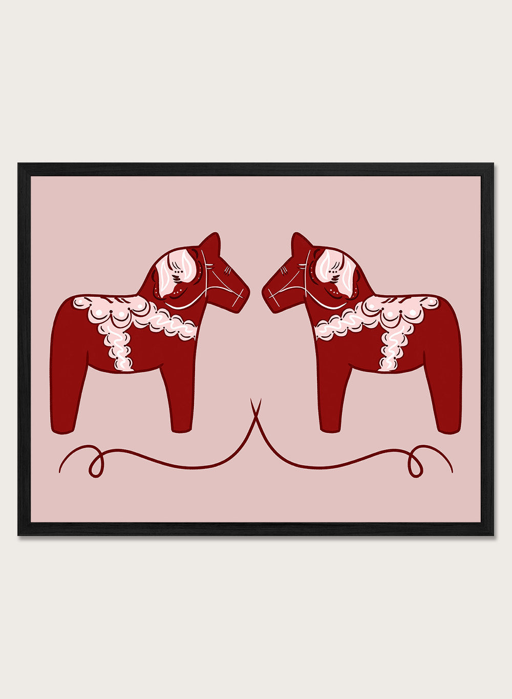 Nordic Horses Twins by Athene Fritsch features two traditional Swedish Dala horses facing each other in a simple, symmetrical layout. The bold red horses, detailed with white folk-style patterns, sit against a soft pink background, giving the artwork a strong graphic look that still feels warm and inviting.