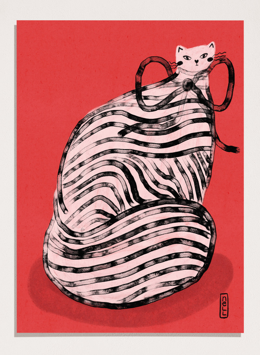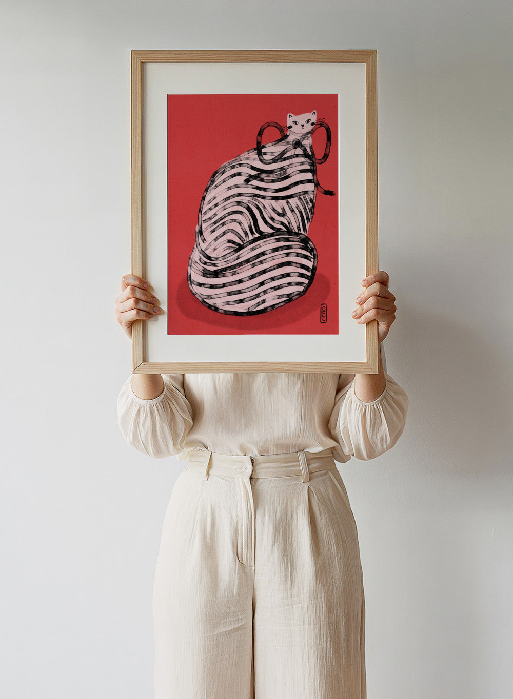 Illustration of a cat inside a ball of yarn on a red background. Black and White Striped Cat by Dirkie Nell is a playful cat art print featuring bold stripes and a red background. A colorful modern animal wall poster.