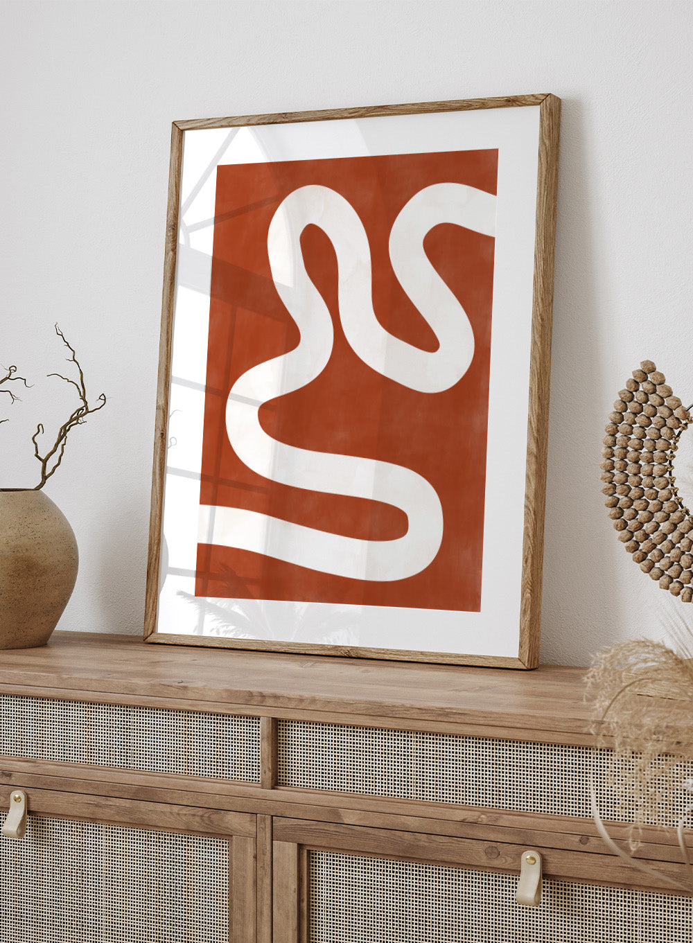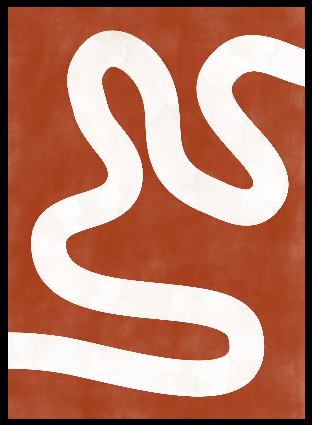 White wavy line on a red background. Crimson Pathways art print by Elena Ristova featuring a flowing white abstract line on a rust red background. Officially licensed modern abstract wall poster.