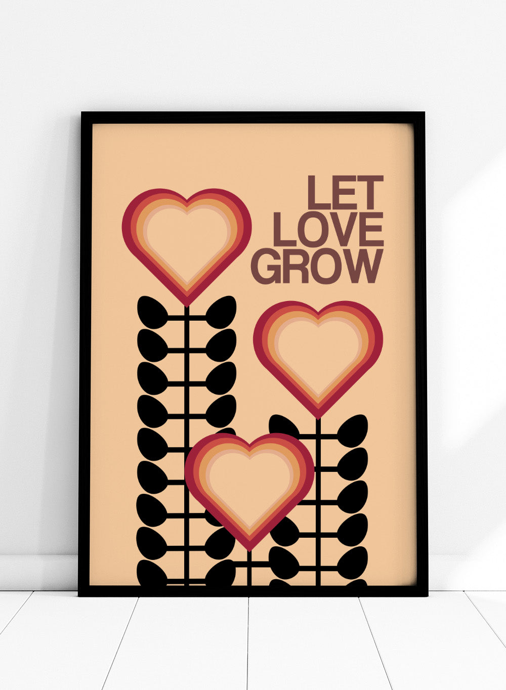 Decorative poster with hearts and leaves on a beige background with 'Let Love Grow' text. Let Love Grow by Frances Collett art print featuring heart-shaped flowers, bold stems, and retro colors. Officially licensed wall poster with optional framing.