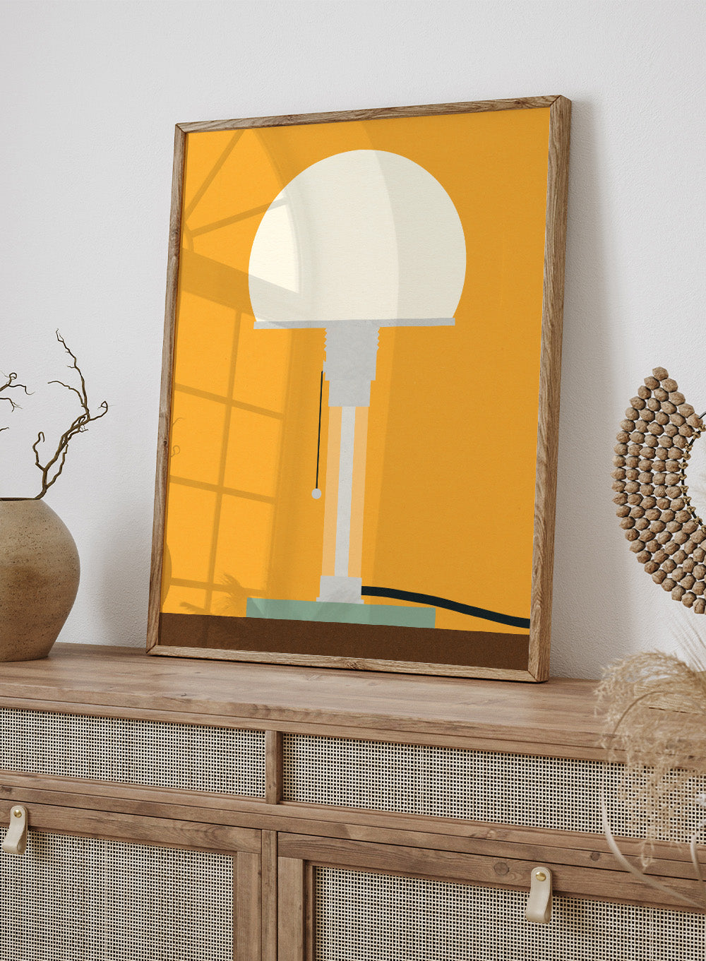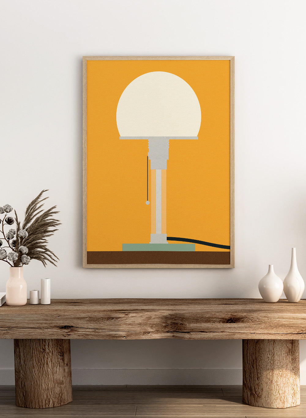 Wagenfeld WG24 Table Lamp by Rosi Feist is a modern minimalist art print inspired by one of the most iconic Bauhaus lighting designs. A glowing white sphere sits atop a clean geometric base, set against a warm golden background that feels simple, calm, and striking.