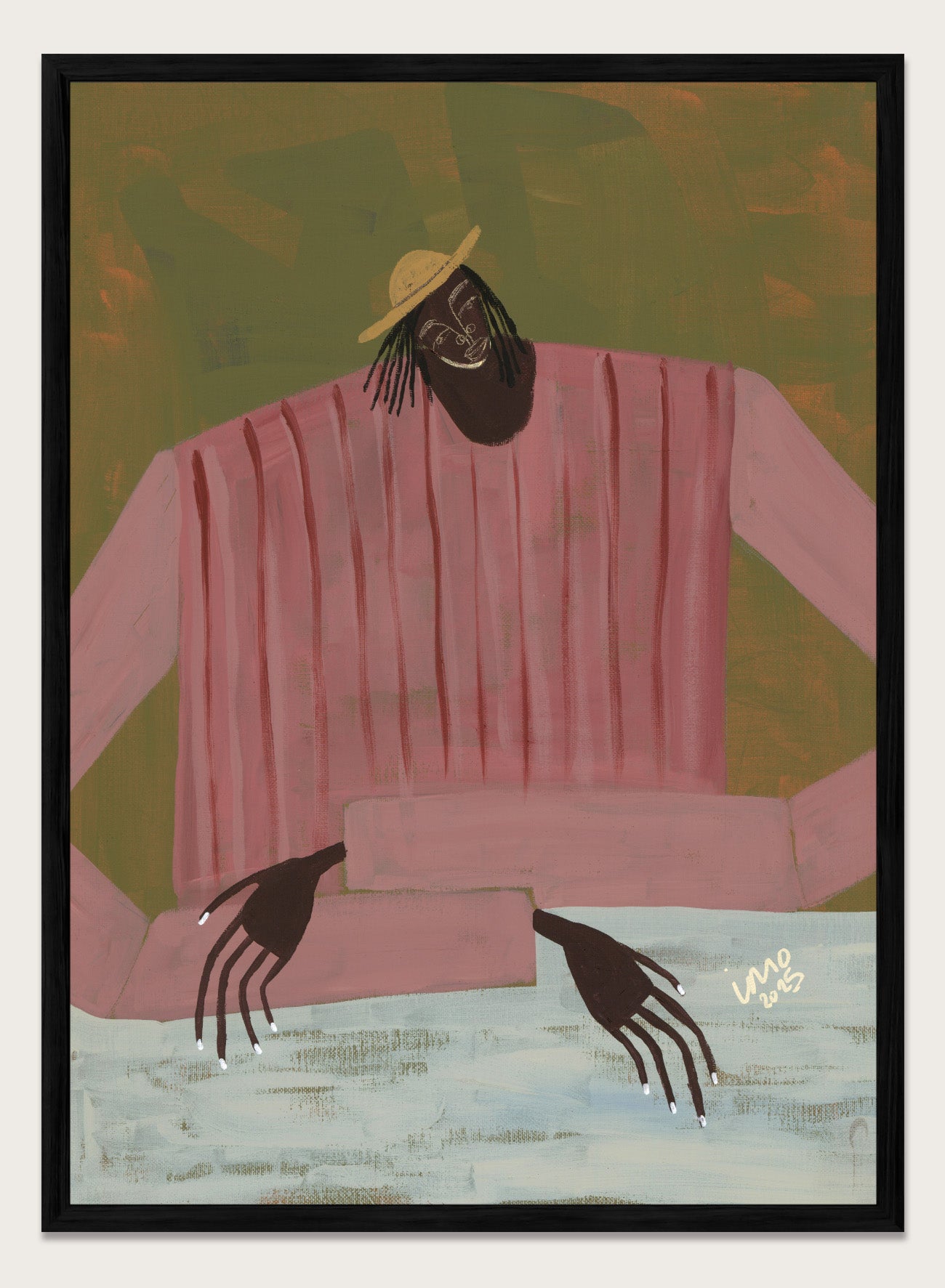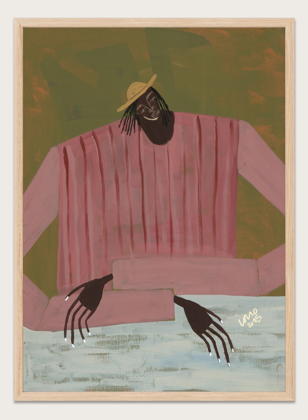 For Now I Don’t Know by Studio IMO (Ibi Meier-Oruitemeka) centers a single figure leaning forward, head slightly tilted, with hands resting across the table in a loose, unguarded way. The composition is pared back, with soft color blocks and minimal detail directing focus to posture and gesture. There’s a sense of pause in the figure’s position, not searching for answers, just sitting with uncertainty. It reflects a moment of not knowing, where things aren’t resolved yet.