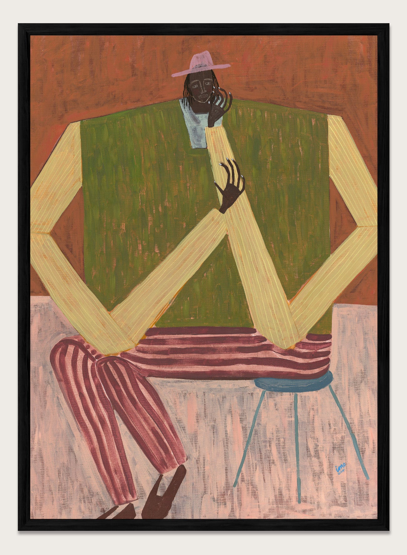 Take a Moment by Studio IMO (Ibi Meier-Oruitemeka) captures a quiet pause. The figure sits with one hand resting against their face, the other placed across the body, creating a sense of stillness that feels intentional. The composition is structured but relaxed, with long limbs and grounded posture holding the space without tension. The color palette adds warmth, but the focus stays on the gesture, a moment of reflection, slowing down, and being present with yourself.