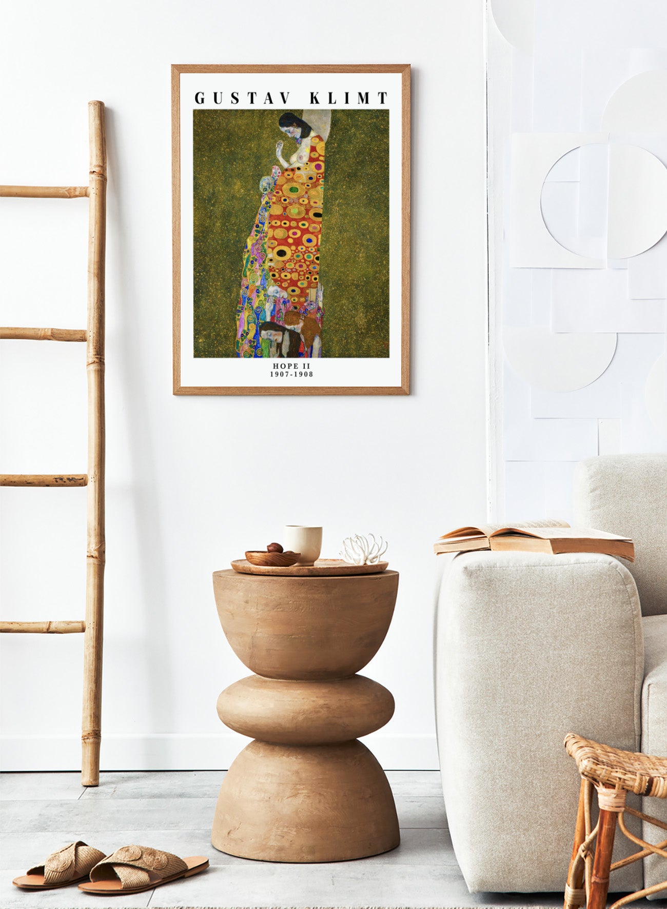 Vintage reproduction artwork by Austrian artist Gustav Klimt: Hope II 1907-1908. Wall art is an affordable and easy way to refresh your space instantly! These are high-quality art prints made on museum-grade fine art paper with a premium matte finish that yields long-lasting brilliance to brighten up any room.