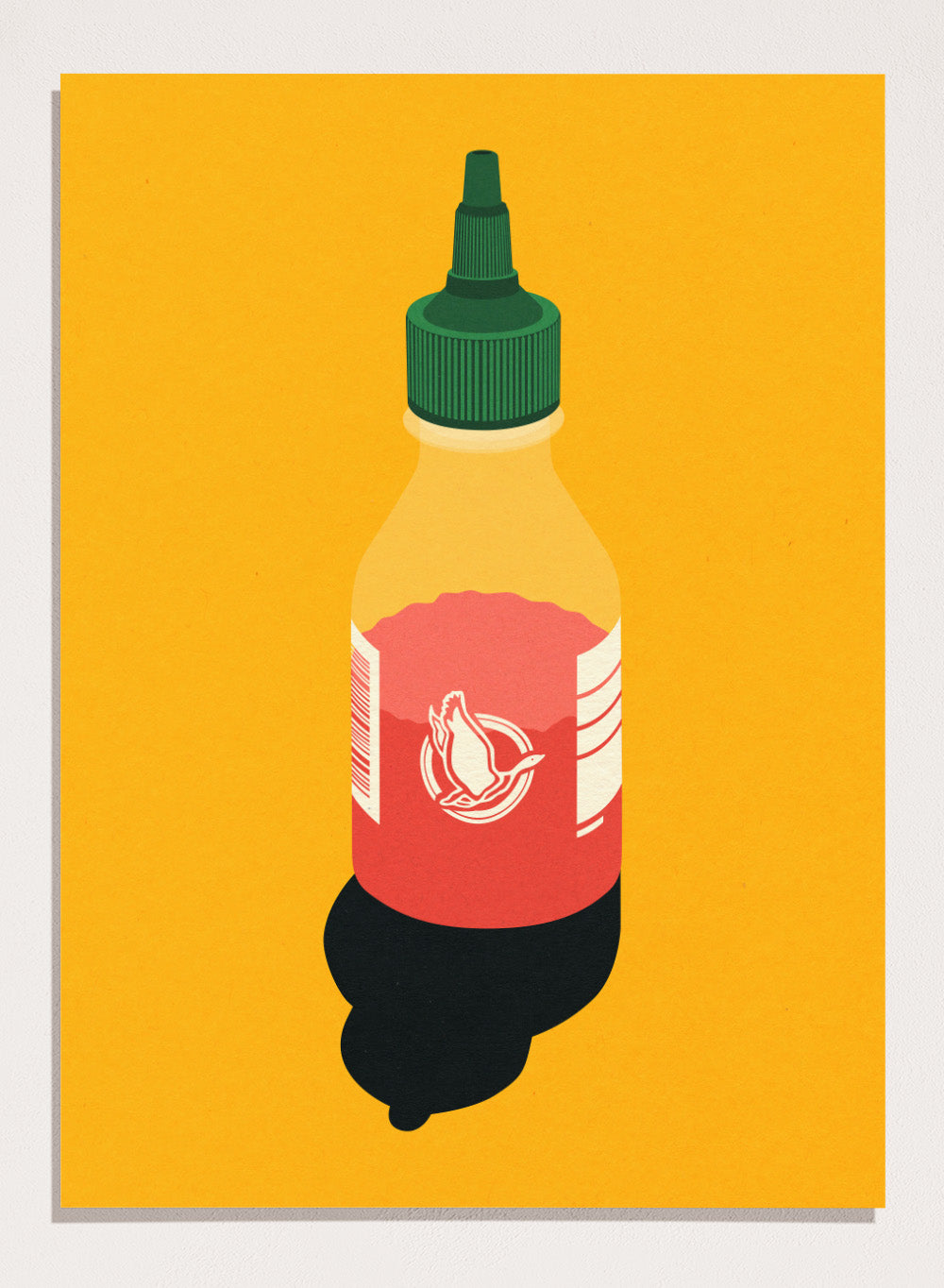 Chilli sauce bottle illustration on a yellow background. Chilli Sauce by Rosi Feist is a bold kitchen art print featuring a hot sauce bottle in modern graphic style. Contemporary food poster wall art.