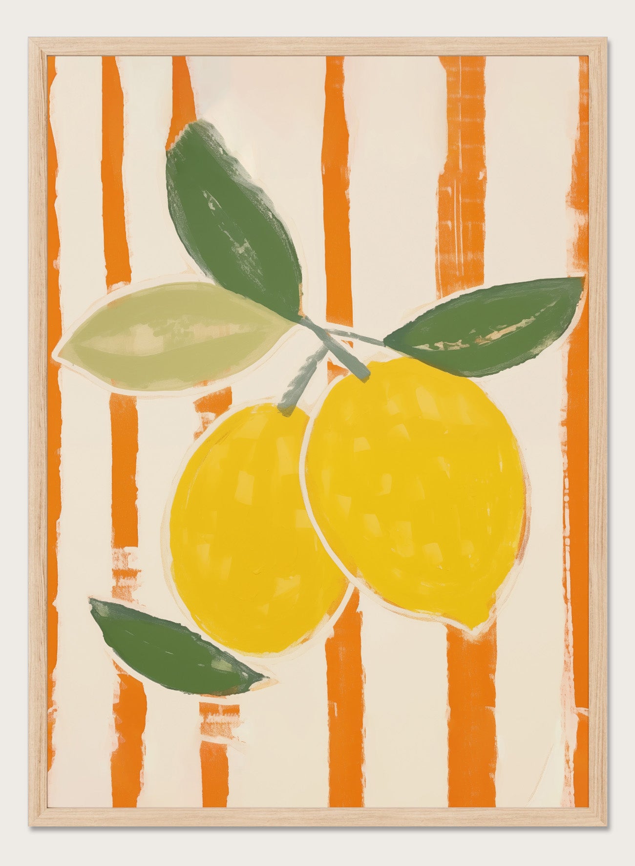 Bold, bright, and full of zest. This fruit wall art print features two lemons layered over a vivid orange striped backdrop. The mix of graphic lines and fresh citrus tones brings playful energy to kitchens, pantries, or gallery walls that need a little sunshine.