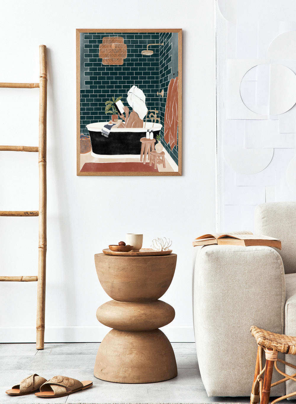 This is officially licensed artwork by Ivy Green. Her work focuses on everyday rituals and emotional spaces, using bold color, clean shapes, and a modern illustrative style to turn simple moments into something meaningful. In Bathroom Babe, rest isn’t rushed. It’s intentional, private, and grounding.