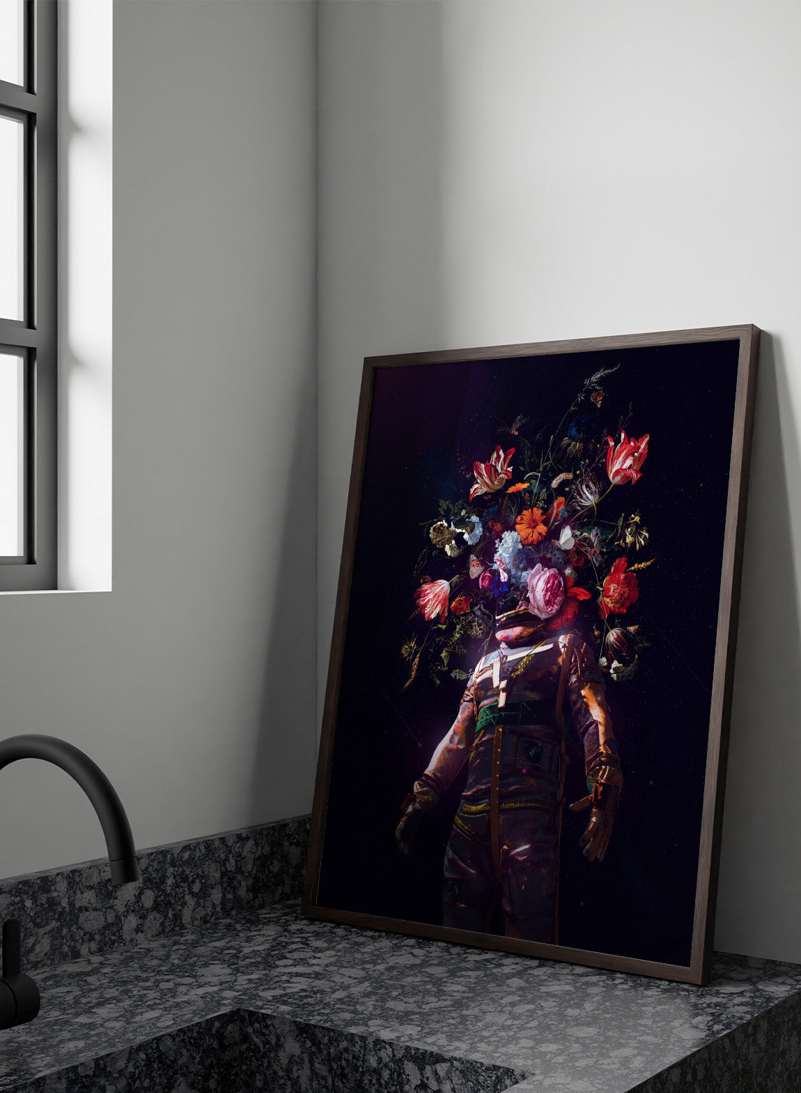 Cosmic Garden Astronaut by Nicebleed takes that same idea of space and flips it into something full and alive. The astronaut stands against a deep night sky, but instead of a helmet, there’s a dense burst of flowers growing outward in every direction. Bright tulips, roses, and wild blooms stretch up and out, catching light and adding movement against the stillness of space. The suit feels grounded and heavy, while everything above it feels loose, growing, and impossible to contain. It’s that contrast, something built to survive isolation, now completely taken over by life.